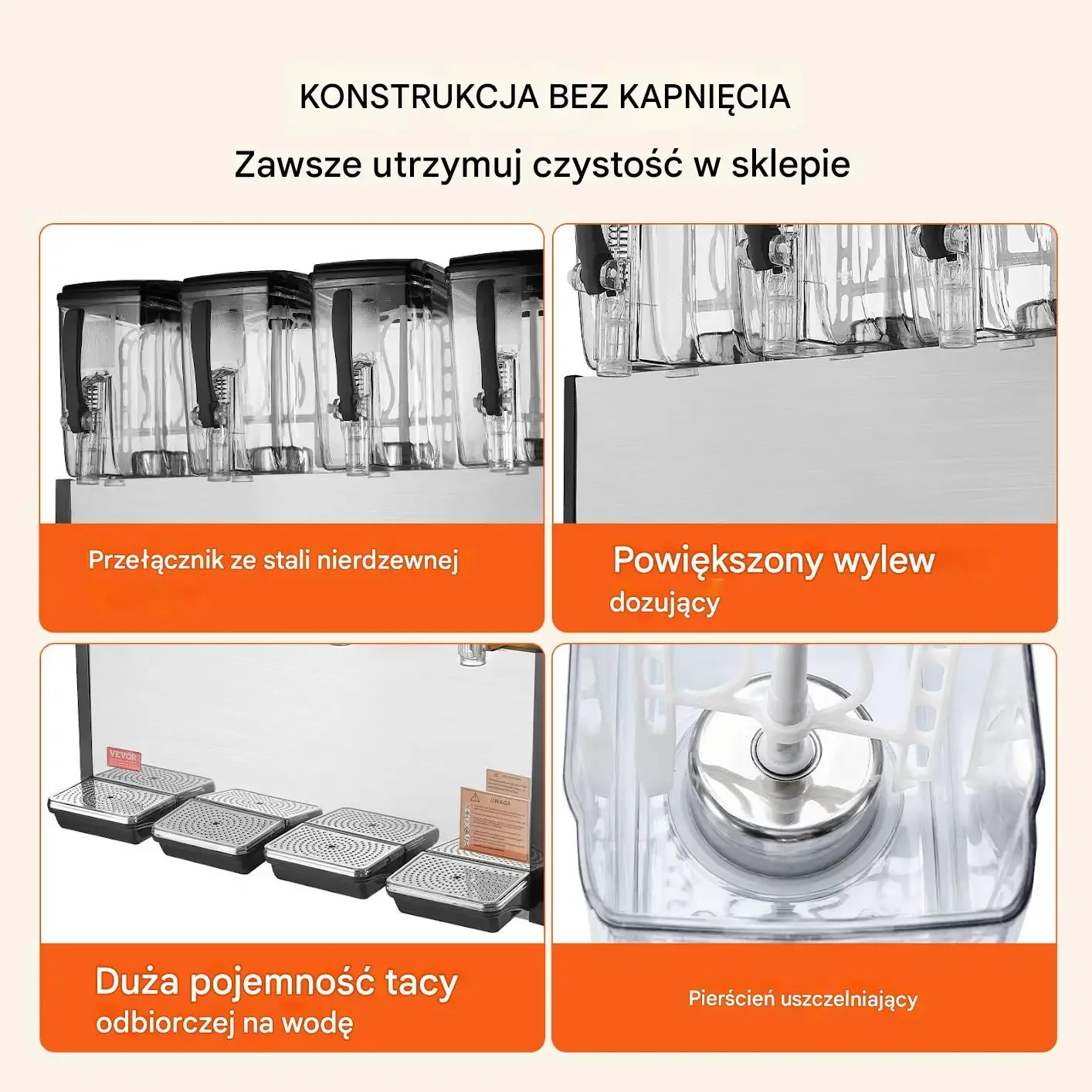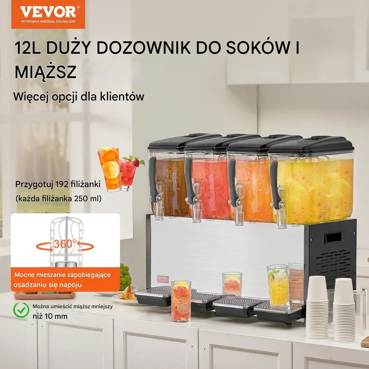 - ✅ Duża pojemność: 4 zbiorniki po 12 litrów – idealne do serwowania dużych ilości napojów