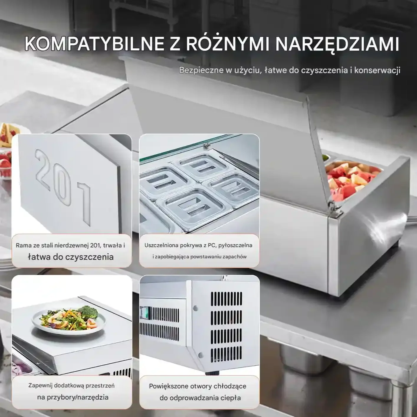 - Pojemniki: 2 x 1/3 pan, 4 x 1/6 pan, stal nierdzewna 304 z pokrywkami PC