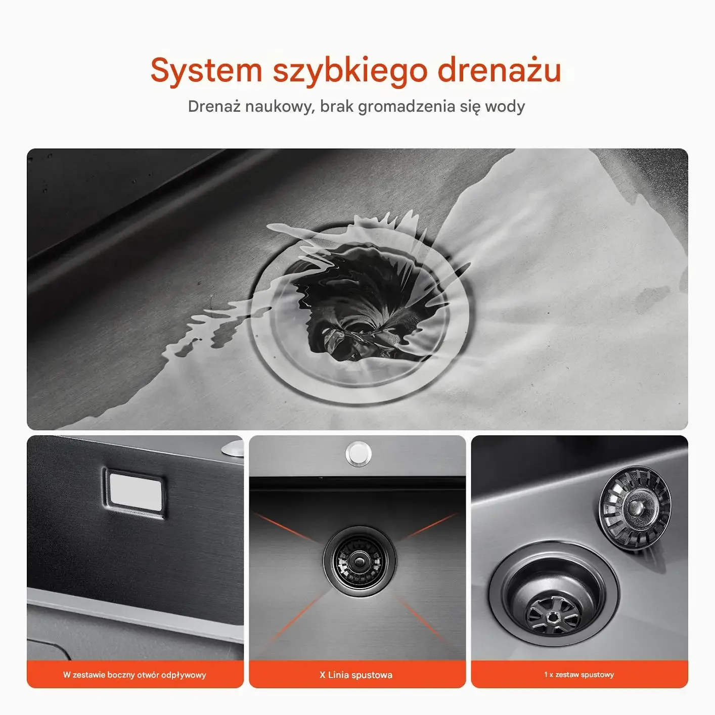 Drenaż naukowy z brakiem gromadzenia się wody, wyposażony w zestaw spustowy (1 x zestaw spustowy) oraz boczny otwór odpływowy, który ułatwia odprowadzanie wody i utrzymanie porządku w kuchni.