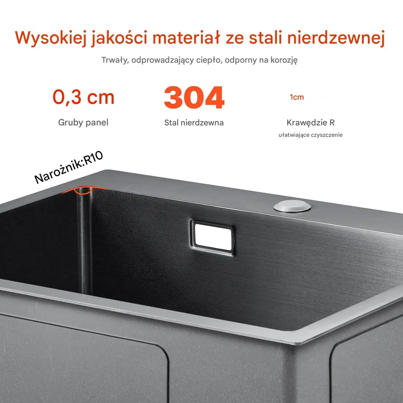 Wykonany z wysokiej jakości stali nierdzewnej 304, o grubości 0,3 cm i solidnym, grubym panelu. Krawędzie wykończone w sposób ułatwiający czyszczenie, z zaokrągleniem narożnika R10 dla łatwiejszego utrzymania higieny.