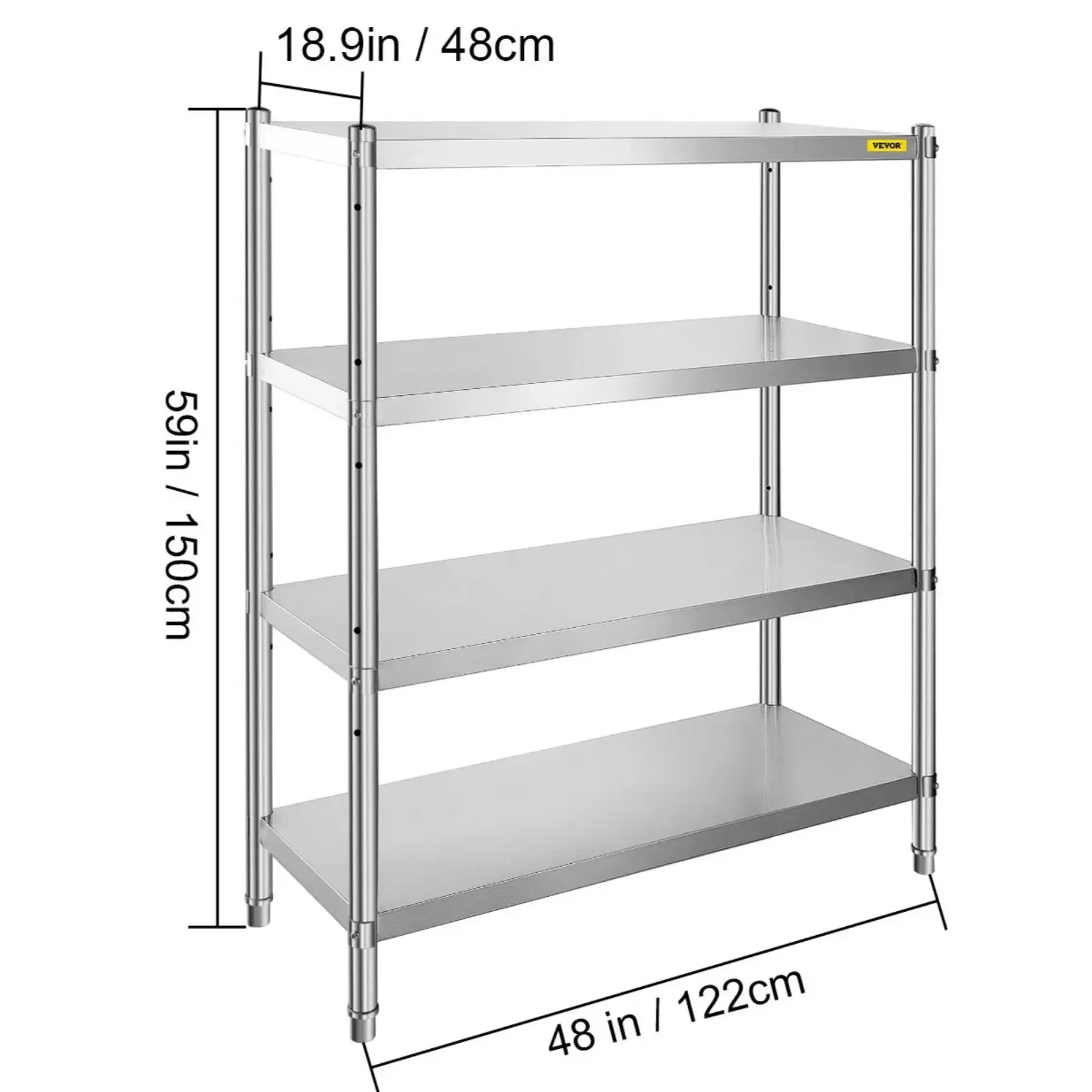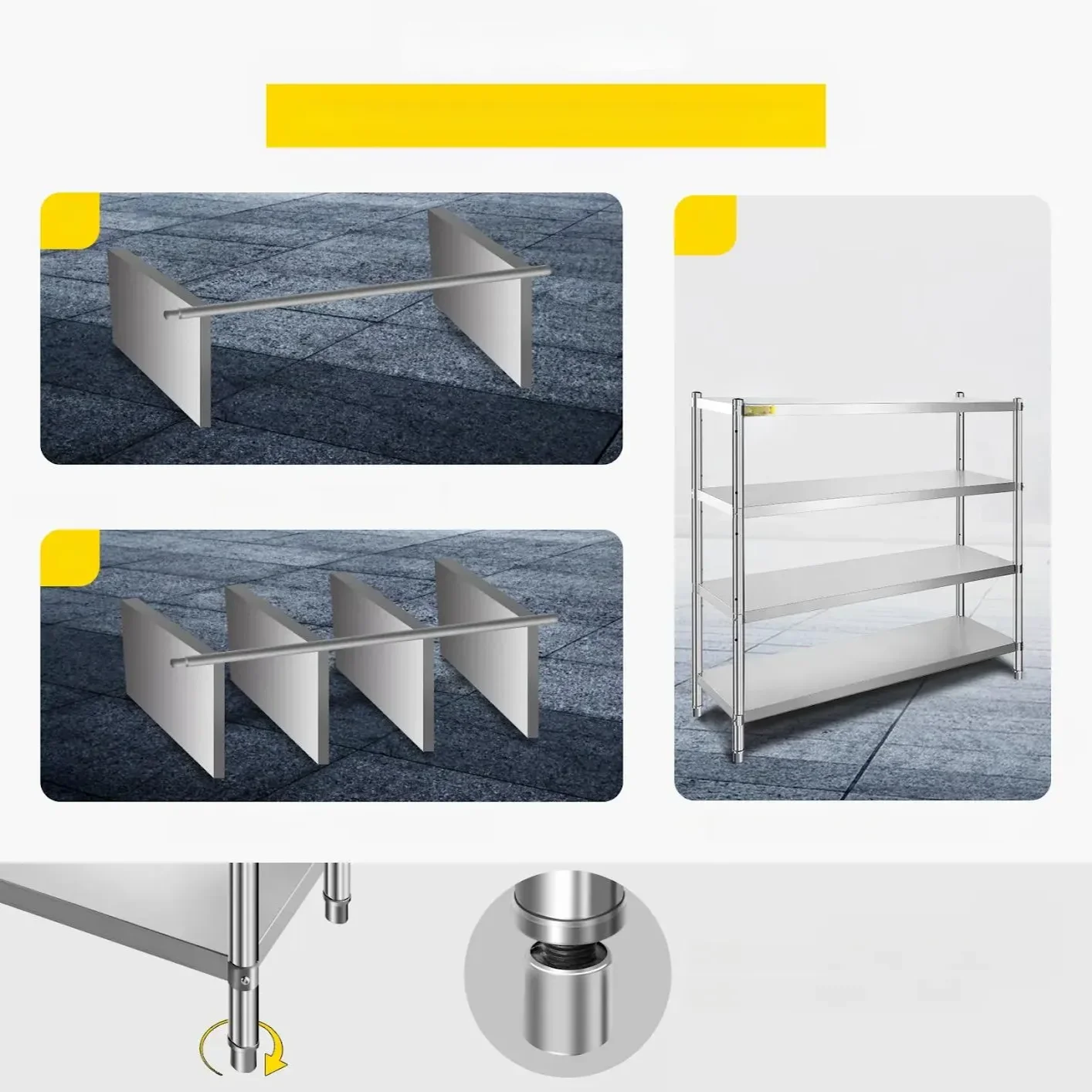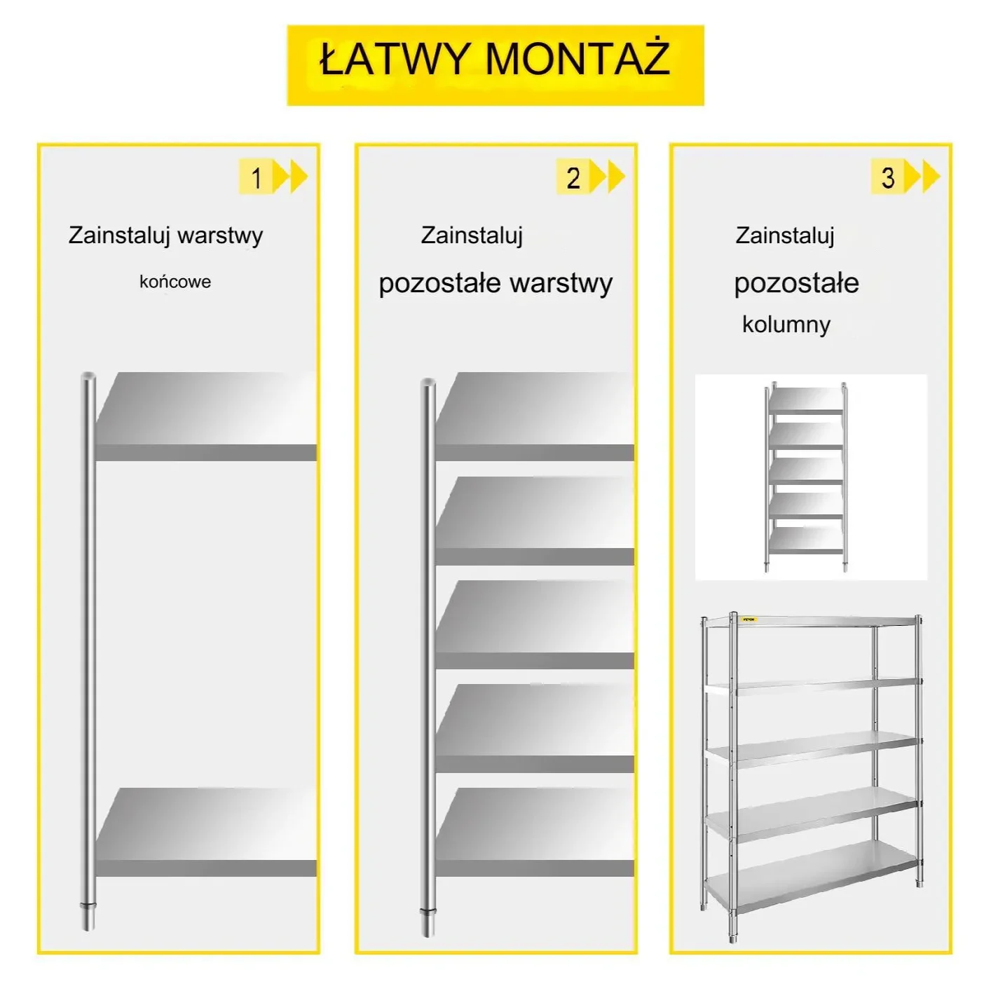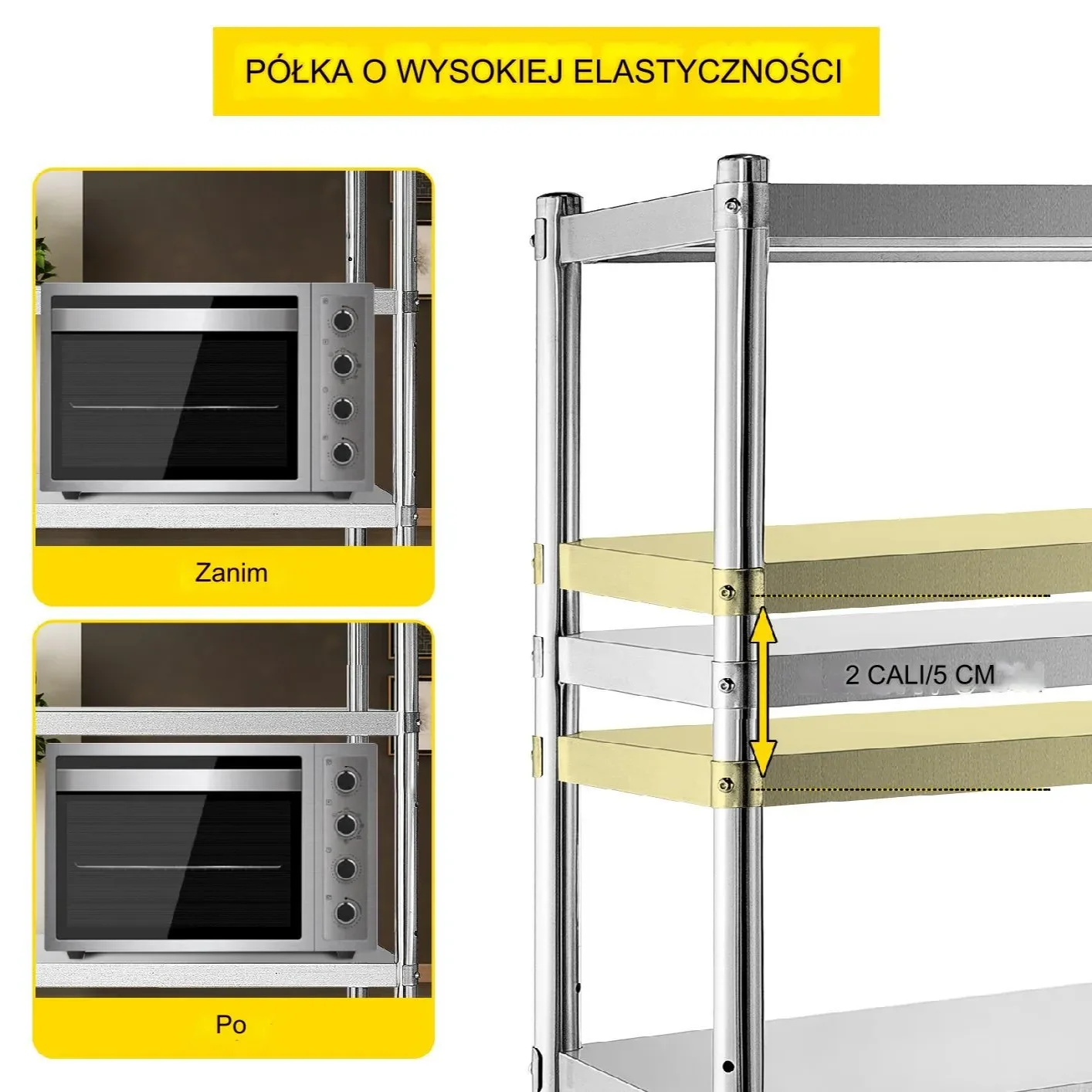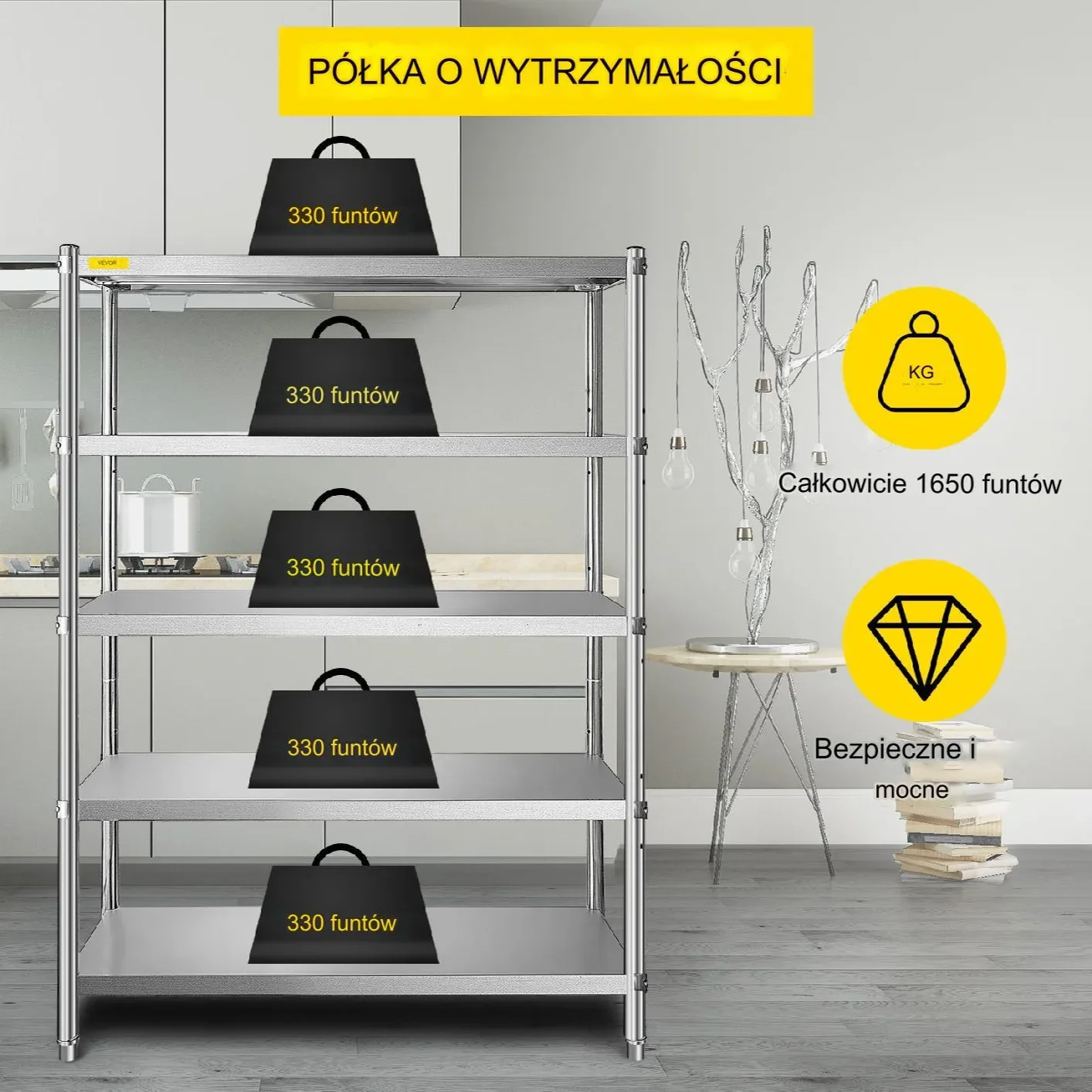 Profesjonalny regał kuchenny gastronomiczny magazynowy wykonany ze stali nierdzewnej, zapewnia wysoką wytrzymałość, odporność na korozję i łatwe czyszczenie. Dzięki solidnej konstrukcji i pięciu poziomom, jest idealnym rozwiązaniem do kuchni restauracyjnych, magazynów, garaży oraz innych przestrzeni wymagających wydajnego przechowywania.