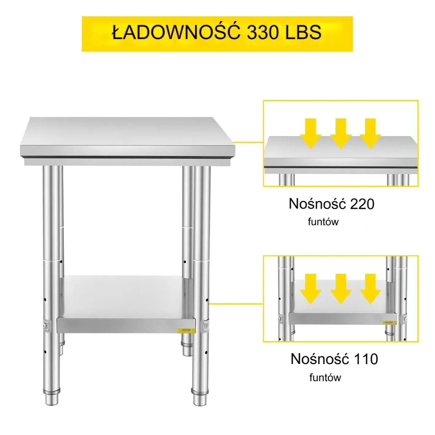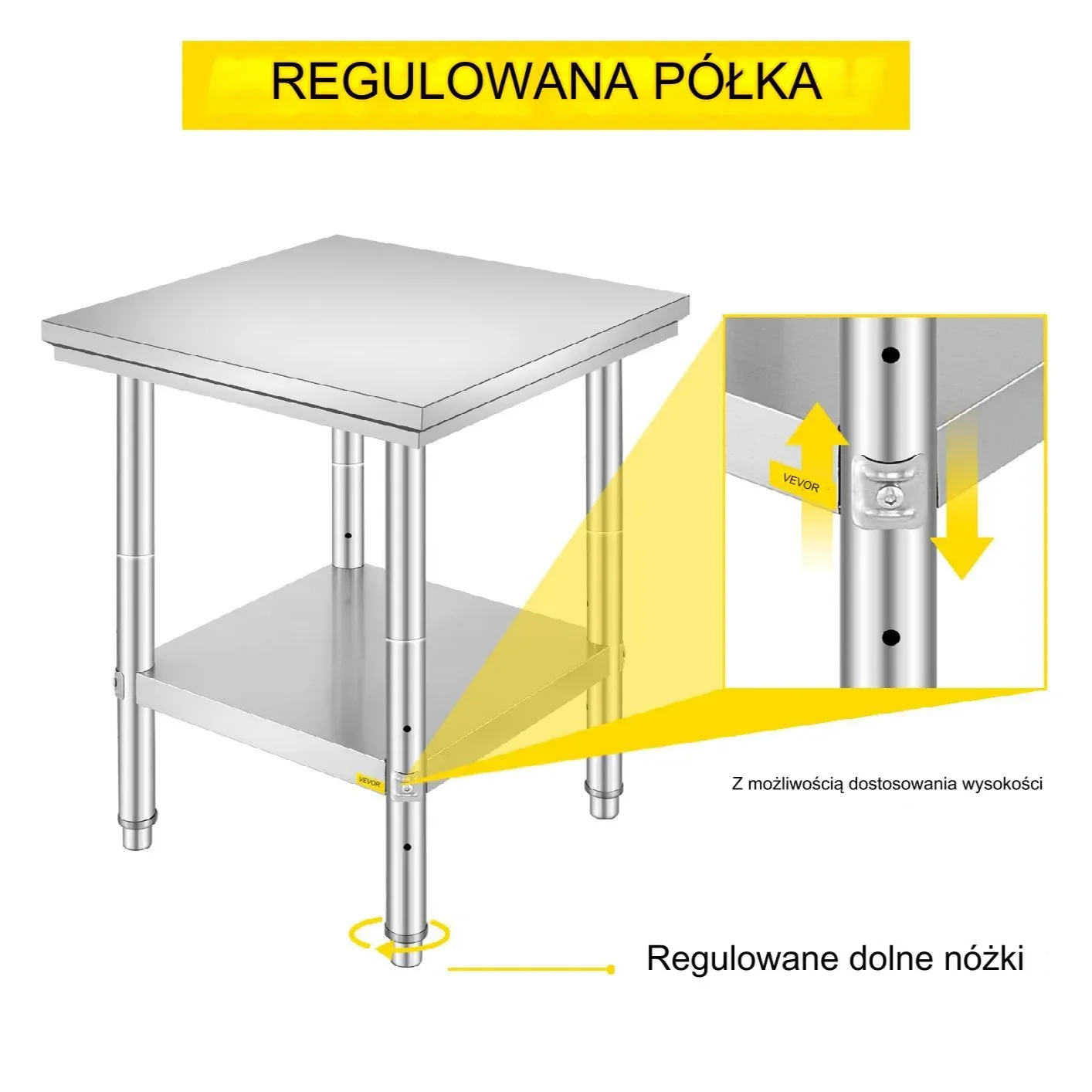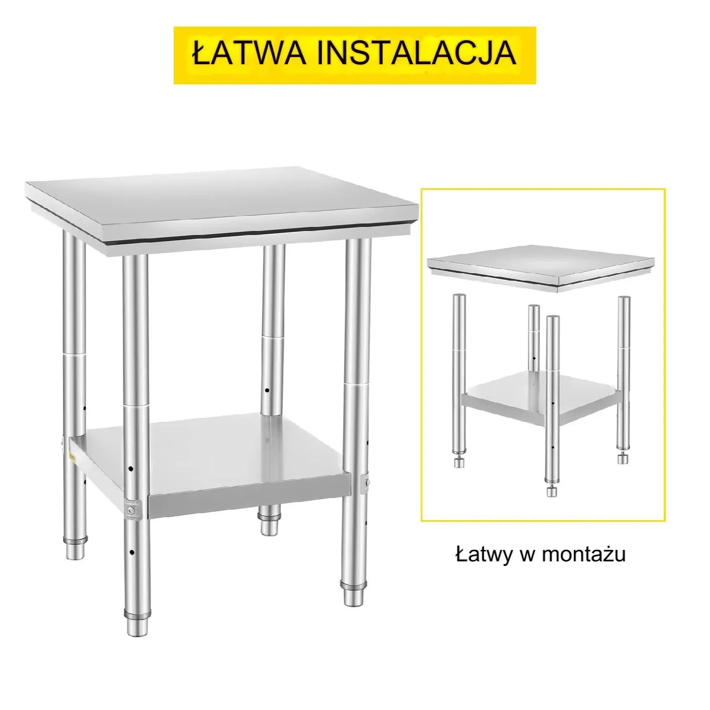 Zorganizuj swoją przestrzeń jak profesjonalista! Stół roboczy o wymiarach 60 x 60 x 80 cm wykonany ze stali nierdzewnej to idealne rozwiązanie do kuchni, warsztatu czy garażu. Regulowana półka, stabilna konstrukcja i nośność do 320 kg sprawią, że każda praca stanie się łatwiejsza. Wybierz jakość, która trwa latami!
