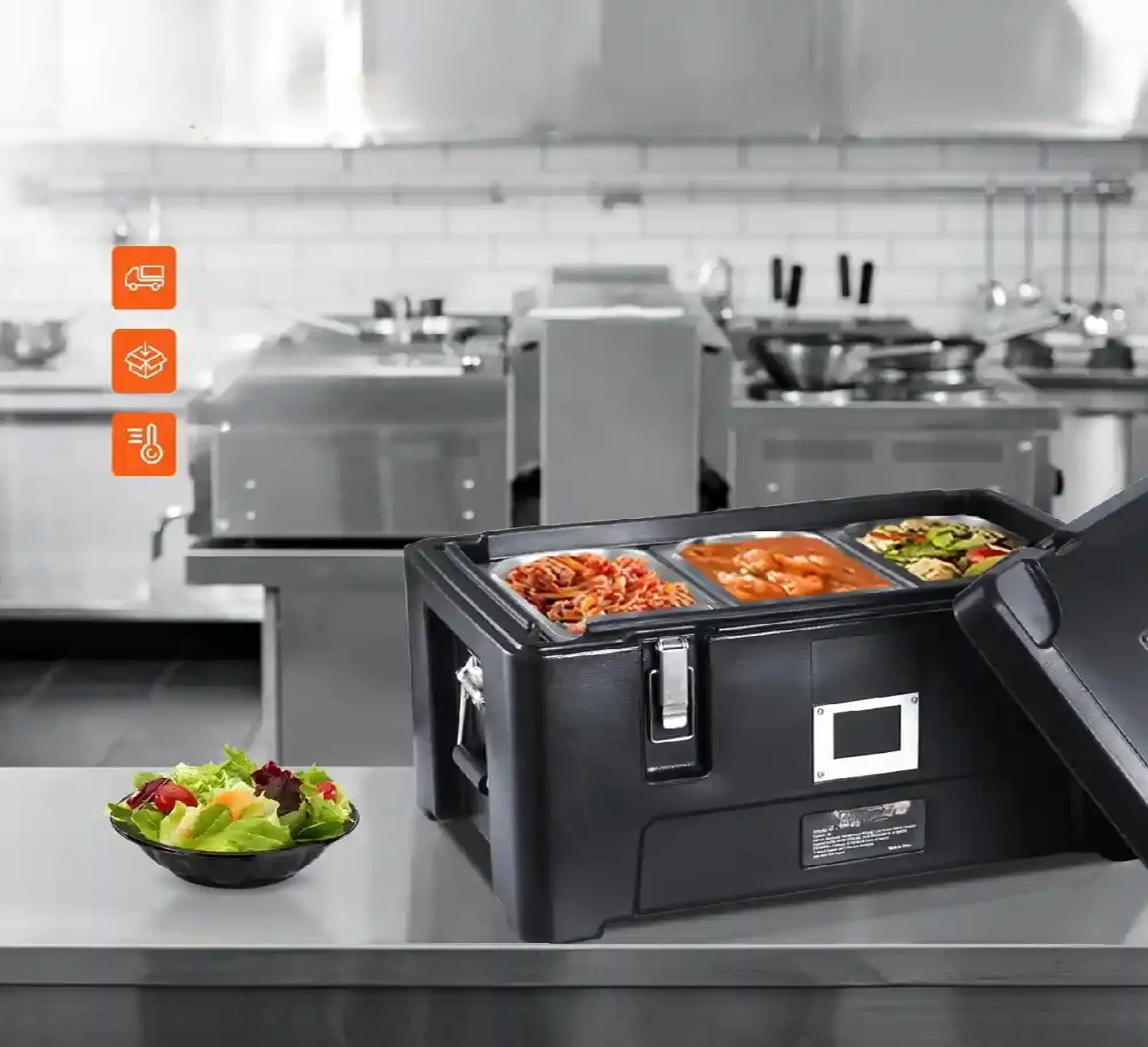 - ✅Doskonała izolacja: Gruba warstwa pianki poliuretanowej utrzymuje temperaturę potraw (ciepło lub zimno) przez wiele godzin, minimalizując straty.