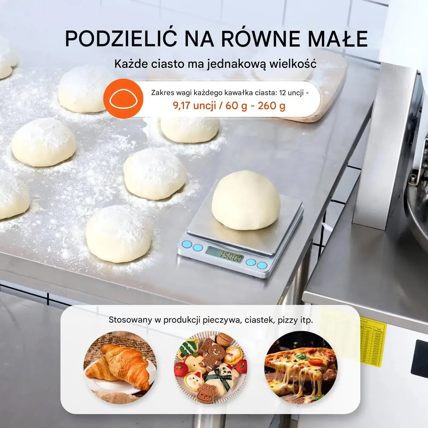 • Szybka i efektywna: Szybkie i wydajne dzielenie ciasta, zapobiegające nierównościom ręcznego porcjowania.