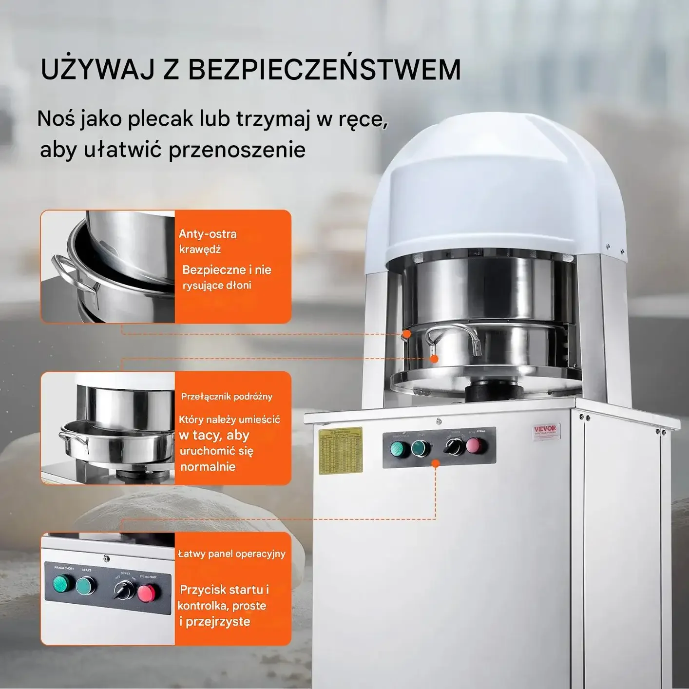 Dzielarka do ciasta została zaprojektowana z myślą o bezpieczeństwie użytkowania. Posiada anty-ostre krawędzie, które są bezpieczne i nie rysują dłoni. Wygodny panel operacyjny z przyciskami startu i kontroli jest prosty i przejrzysty.