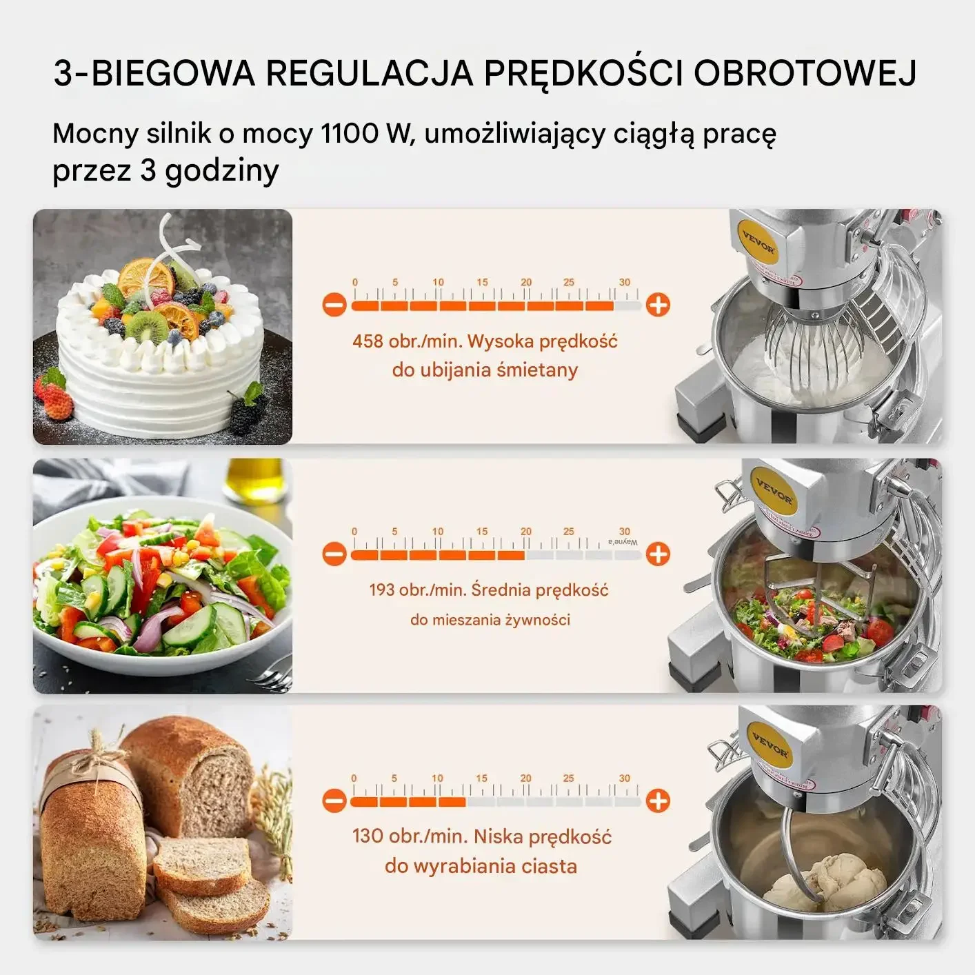 • Efektywny system mieszania: Silnik o mocy 1100W i przekładnia z napędem zębatym zapewniają szybkie i jednolite mieszanie. 3 regulowane prędkości: 130 obr./min (ugniatanie ciasta), 193 obr./min (mieszanie farszów), 458 obr./min (ubijanie śmietany).
