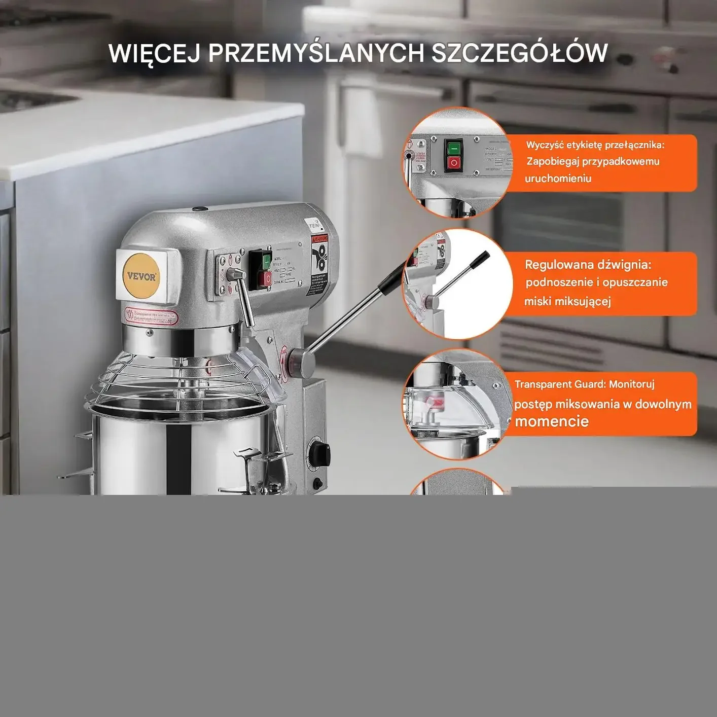 Dźwignia umożliwia regulację podnoszenia i opuszczania miski miksującej. Transparentna osłona pozwala monitorować postęp miksowania w dowolnym momencie. Pokrętło timera służy do ustawienia czasu pracy do 30 minut. Nóżki gumowe zapewniają antypoślizgowe i stabilne ustawienie. Etykieta na przełączniku zapobiega przypadkowemu uruchomieniu.