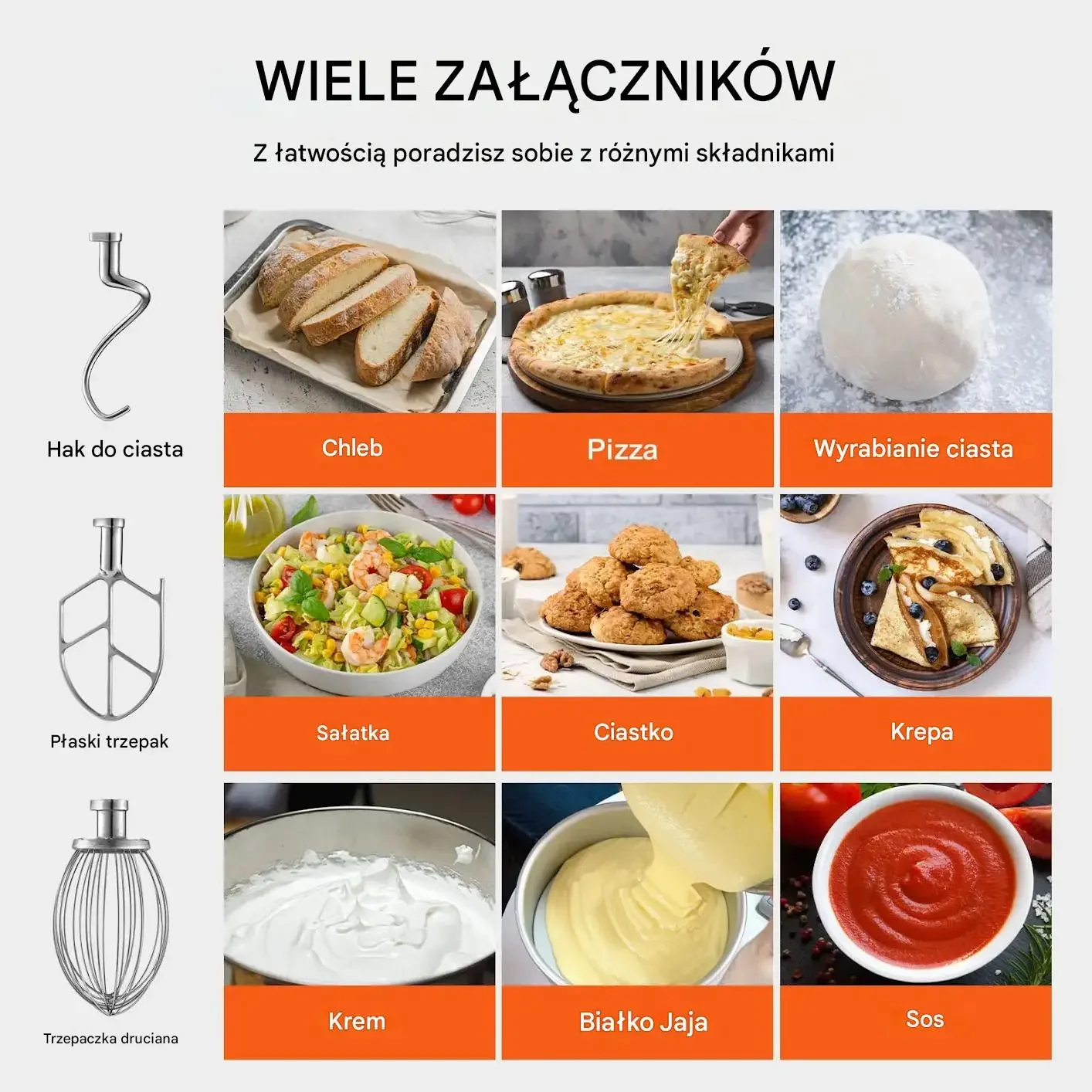 • Wszechstronność: W zestawie 3 mieszadła: hak do ciasta (do ciężkich ciast, np. na pizzę), płaskie mieszadło (do ziemniaków, warzyw, ciast, lukrów), trzepaczka (do ubijania śmietany, białek jaj).
