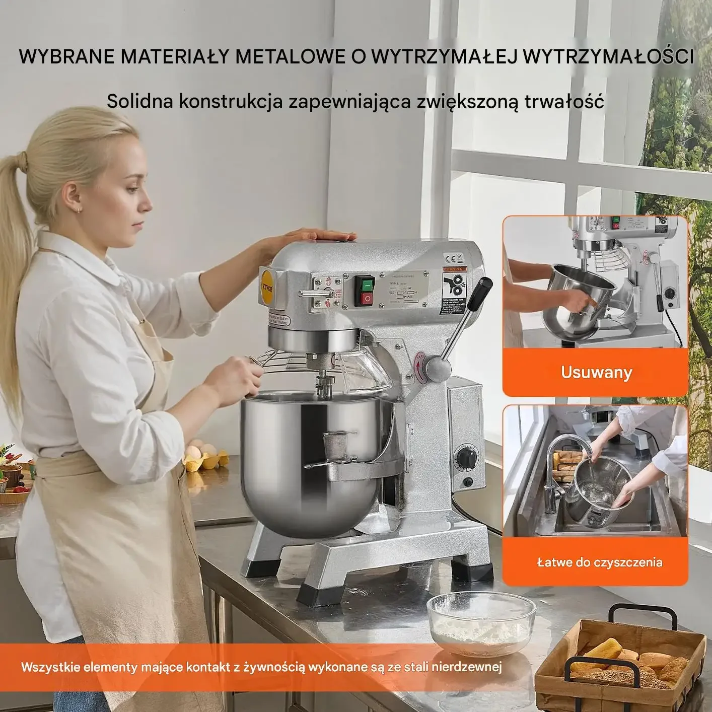 Wszystkie elementy mające kontakt z żywnością wykonane są ze stali nierdzewnej. Miska do mieszania jest usuwalna i łatwa do czyszczenia. Wybrane materiały metalowe o wytrzymałej wytrzymałości zapewniają solidną konstrukcję i zwiększoną trwałość.