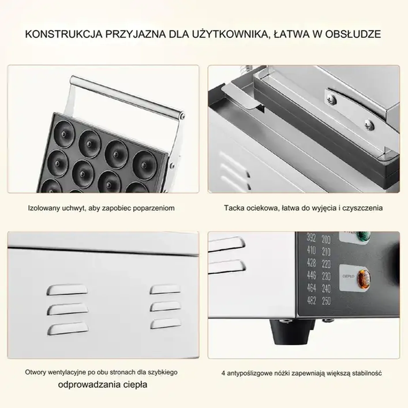 • ✅ Możliwość przygotowania 12 pączków jednocześnie (średnica 50 mm, grubość 20 mm)