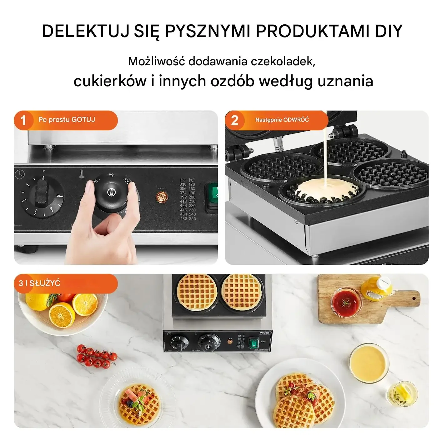 Dzięki gofrownicy VEVOR możesz delektować się pysznymi, samodzielnie przygotowanymi produktami. Urządzenie umożliwia dodawanie czekoladek, cukierków i innych ozdób według uznania, co pozwala na pełną kreatywność w kuchni. Proces przygotowania jest prosty: wystarczy gotować, następnie odwrócić i podawać, ciesząc się świeżymi goframi w zaledwie 5 minut.