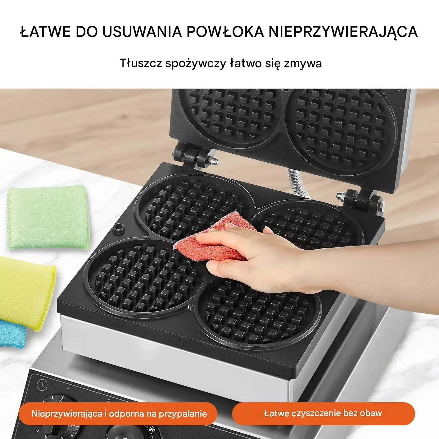 Urządzenie charakteryzuje się łatwą do usunięcia powłoką nieprzywierającą, dzięki której tłuszcz spożywczy łatwo się zmywa. Powierzchnia jest nieprzywierająca i odporna na przypalanie, co zapewnia łatwe czyszczenie bez obaw. Wystarczy przetrzeć wilgotną ściereczką, aby utrzymać gofrownicę w czystości i gotową do następnego użycia.