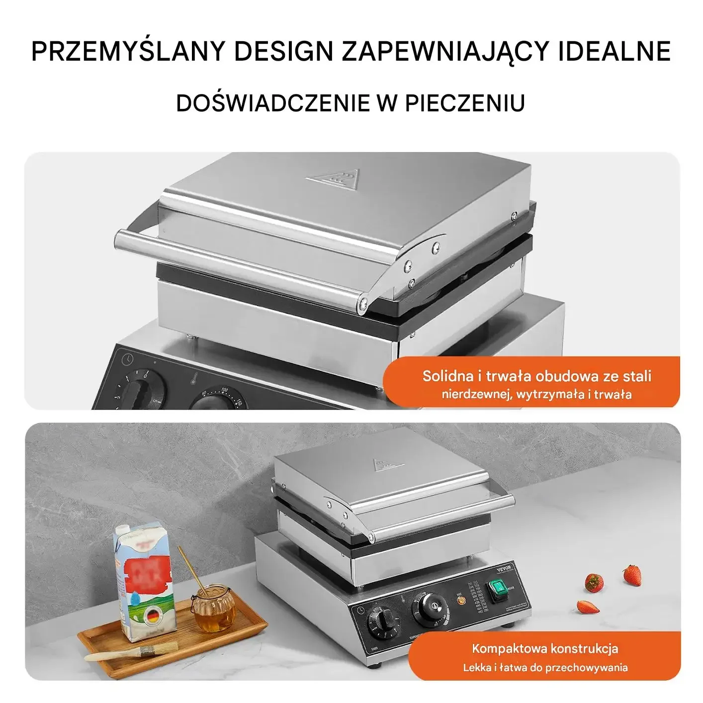 Urządzenie posiada przemyślany design, który zapewnia idealne doświadczenie w pieczeniu. Solidna i trwała obudowa ze stali nierdzewnej gwarantuje wytrzymałość i długotrwałe użytkowanie. Dzięki kompaktowej konstrukcji, gofrownica jest lekka i łatwa do przechowywania, co sprawia, że idealnie nadaje się do kuchni o ograniczonej przestrzeni. Wysokiej jakości materiały zapewniają stabilność i bezpieczeństwo podczas pracy.