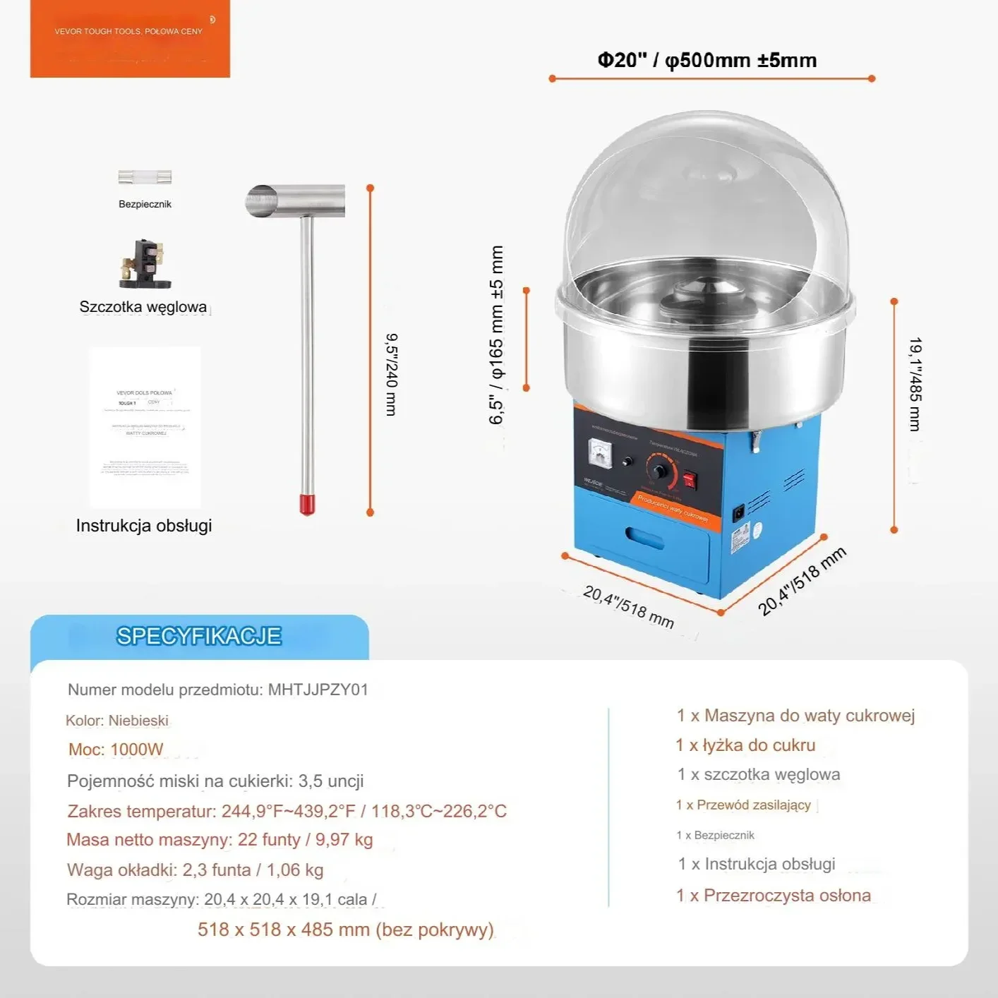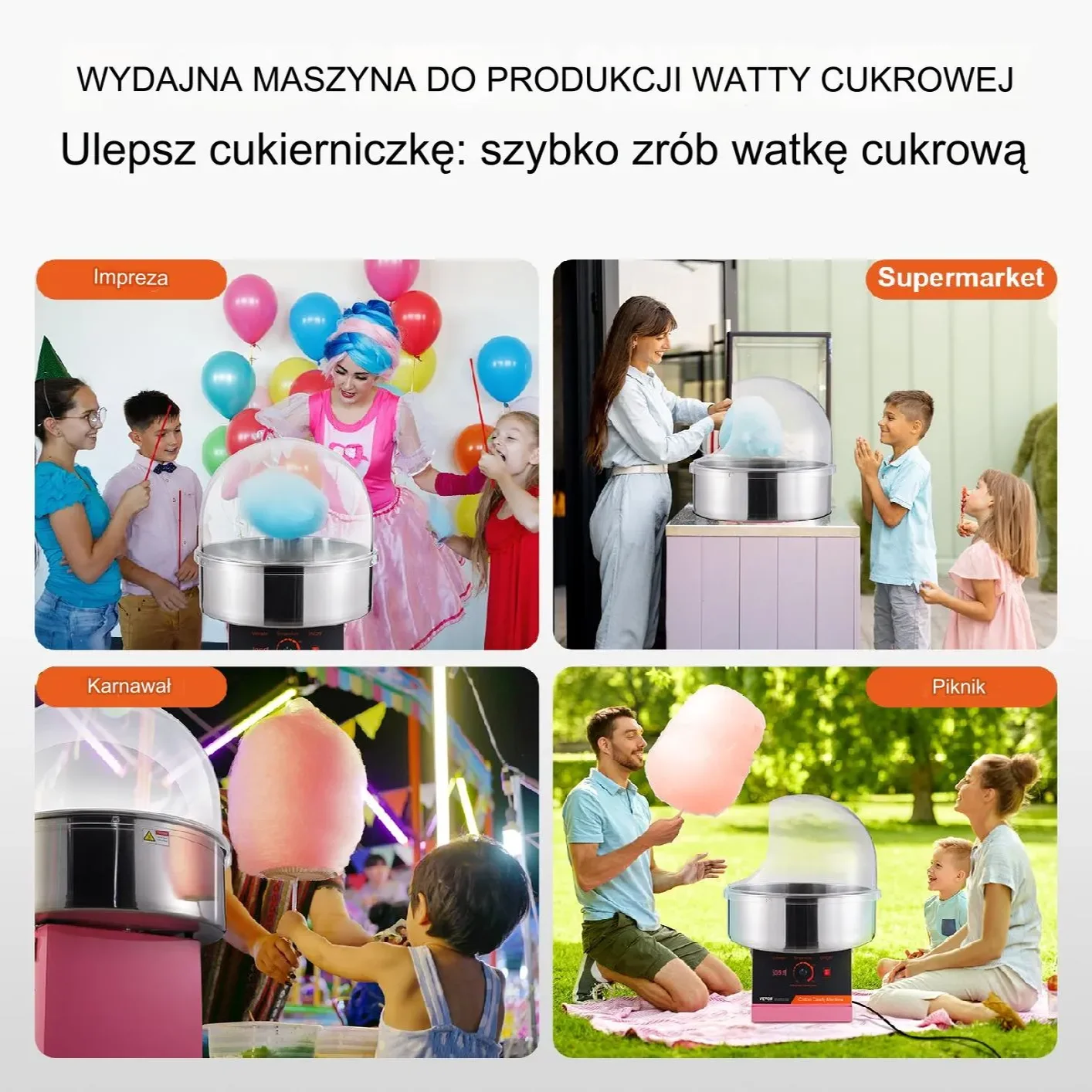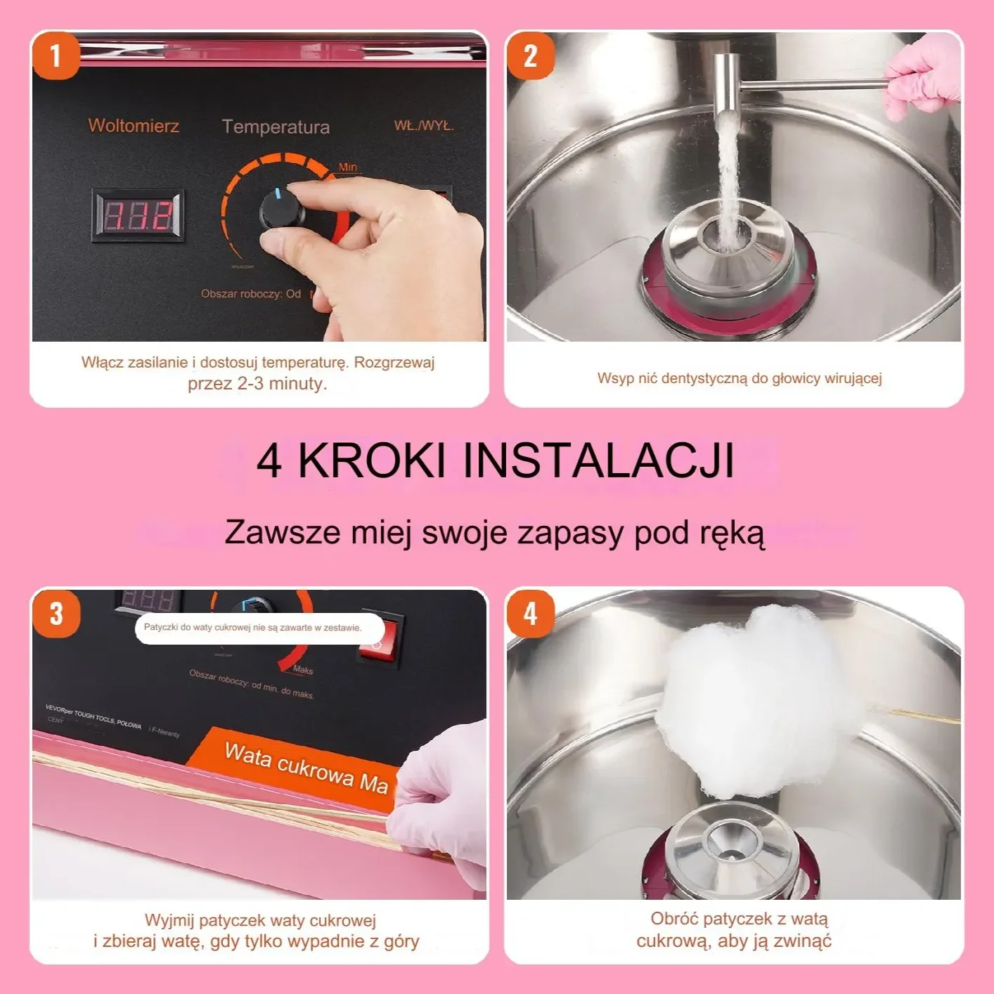 Korzystanie z tego urządzenia nie może być prostsze. Wystarczy włączyć zasilanie, ustawić temperaturę, rozgrzać przez 2-3 minuty i wsypać cukier do wirującej głowicy, a następnie za pomocą patyczków zebrać bawełniane cukierki z głowicy.