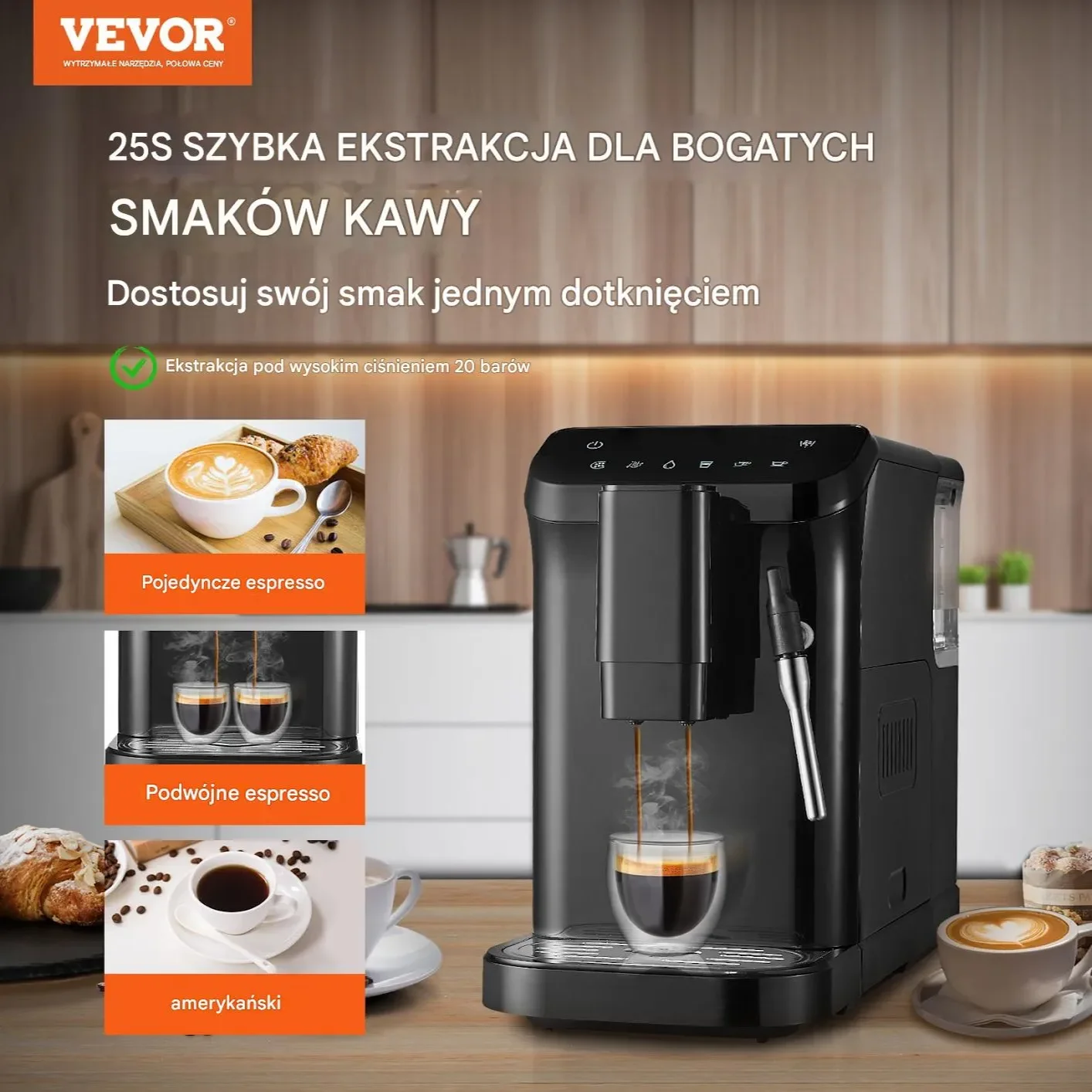 ✅ Ciśnienie 20 bar gwarantujące intensywny aromat i perfekcyjną ekstrakcję kawy.