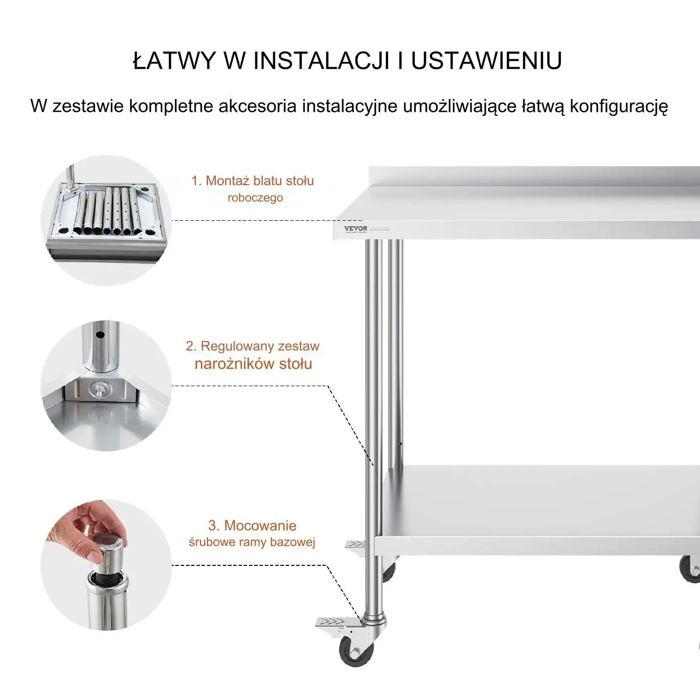 Dzięki zwiększonej grubości 0,8 mm, stół ten jest solidny i trwały. Obie półki wytrzymują duże obciążenia, zapewniając wystarczającą ilość miejsca do przechowywania zapasów i umożliwiając łatwe układanie ulubionych składników.