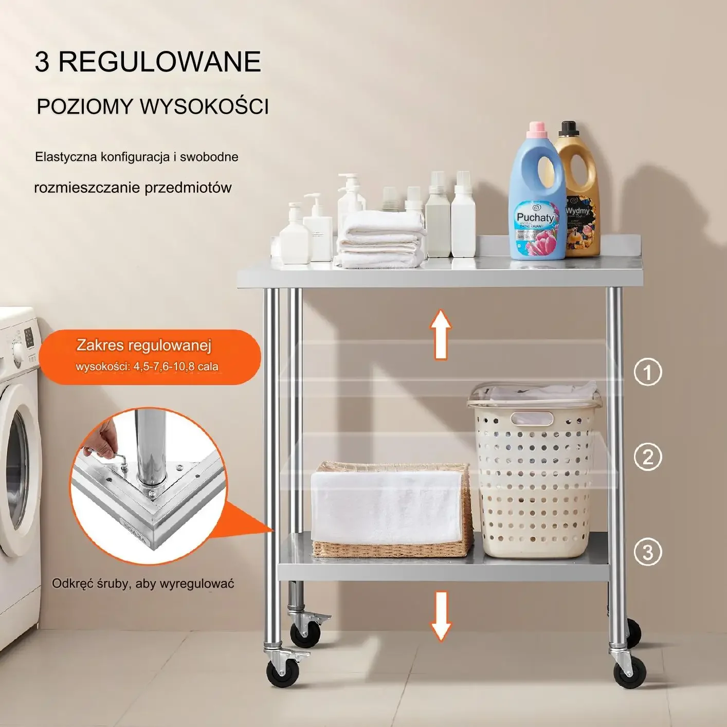 Wyposażony w 3-poziomowe regulowane półki, ten stół roboczy oferuje najbardziej przyjazną dla użytkownika i praktyczną funkcjonalność. Wystarczy wyregulować wysokość półki za pomocą śrub, aby pomieścić przedmioty o różnych rozmiarach. Wyposażony w 4 obrotowe kółka, w tym 2 z hamulcami, stół pozostaje stabilny i można go łatwo przemieszczać w dowolne miejsce. 5-centymetrowa krawędź tylna zapobiega zsuwaniu się cennego sprzętu i materiałów eksploatacyjnych ze stołu, a także chroni przed rozpryskami wody.