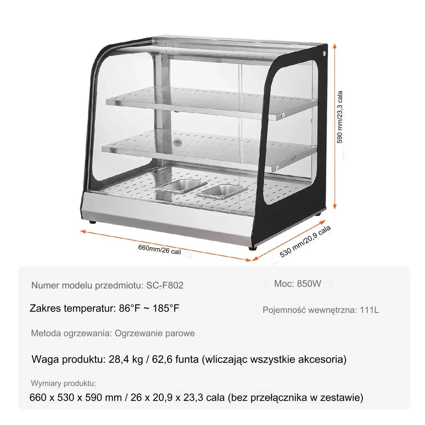 - ✅Duża pojemność 111 L: Urządzenie o wymiarach66 cm x 53 cm x 59 cm posiadadwa przestronne poziomy ze stali nierdzewnej, oferując elastyczne możliwości przechowywania i eksponowania żywności.