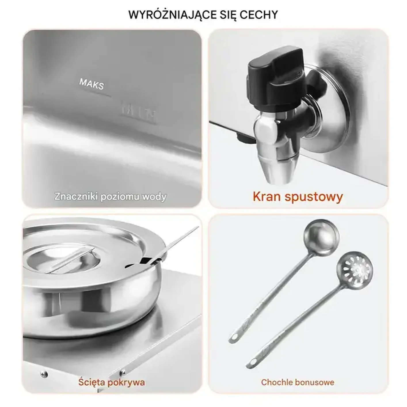 - ✅ Praktyczne dodatki: Wskaźniki poziomu wody wewnątrz ułatwiają jej kontrolę, a dwie długie chochle pozwalają na wygodne serwowanie potraw.