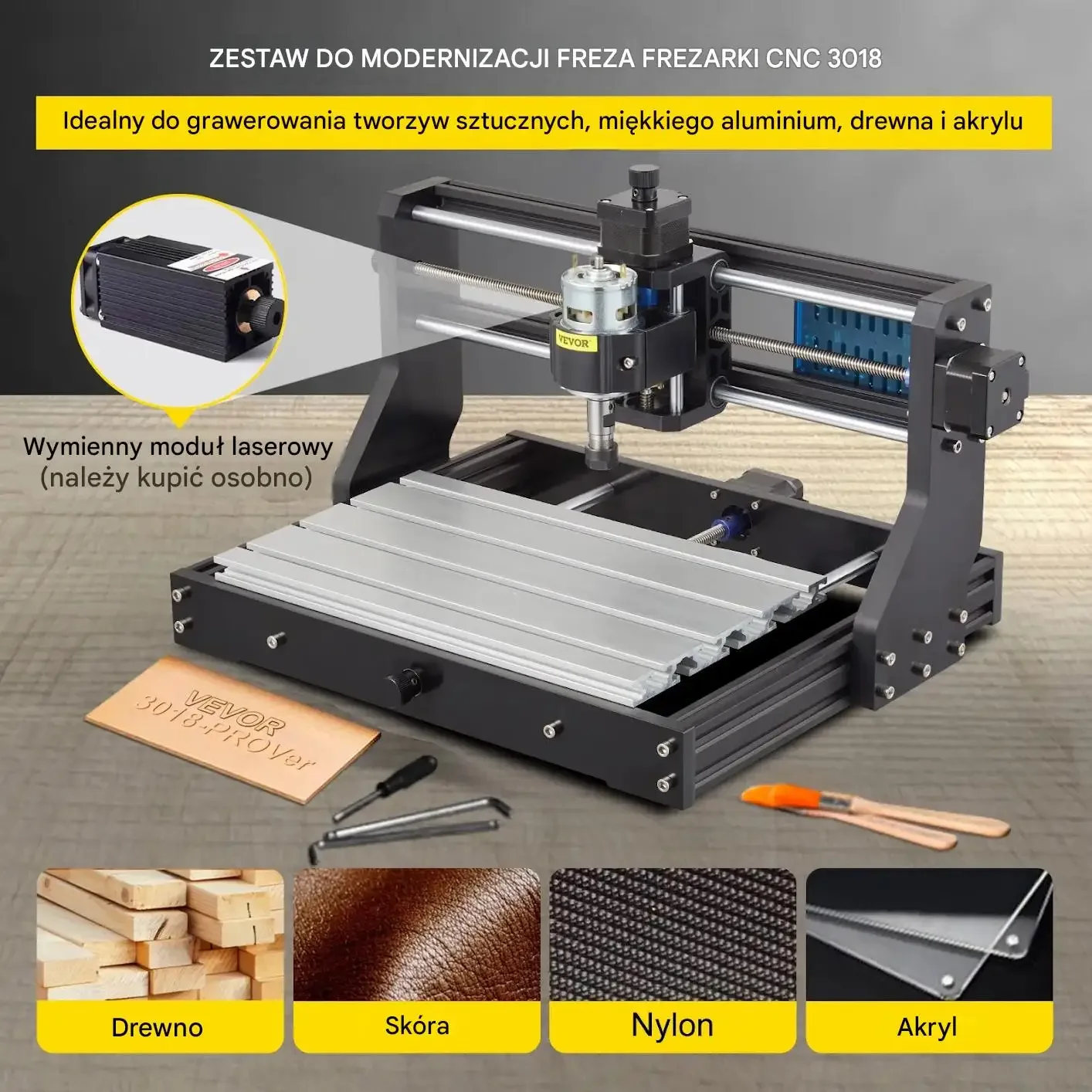 Urządzenie jest idealne do grawerowania i obróbki: tworzyw sztucznych, miękkiego aluminium, drewna oraz akrylu.