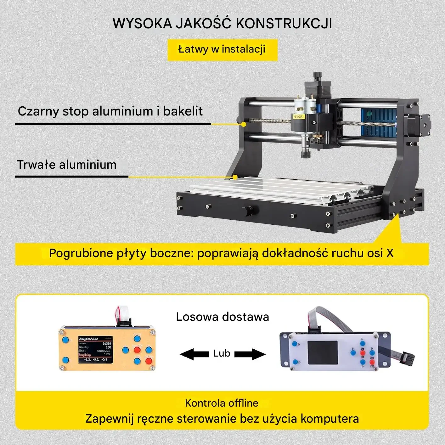 Urządzenie wykonano z czarnego stopu aluminium i bakelitu. Zastosowano trwałe elementy aluminiowe oraz pogrubione płyty boczne, które poprawiają dokładność ruchu osi X. Konstrukcja wspiera łatwą instalację, a zasilenie i układ pracy są przygotowane do modernizacji frezarki CNC 3018.
