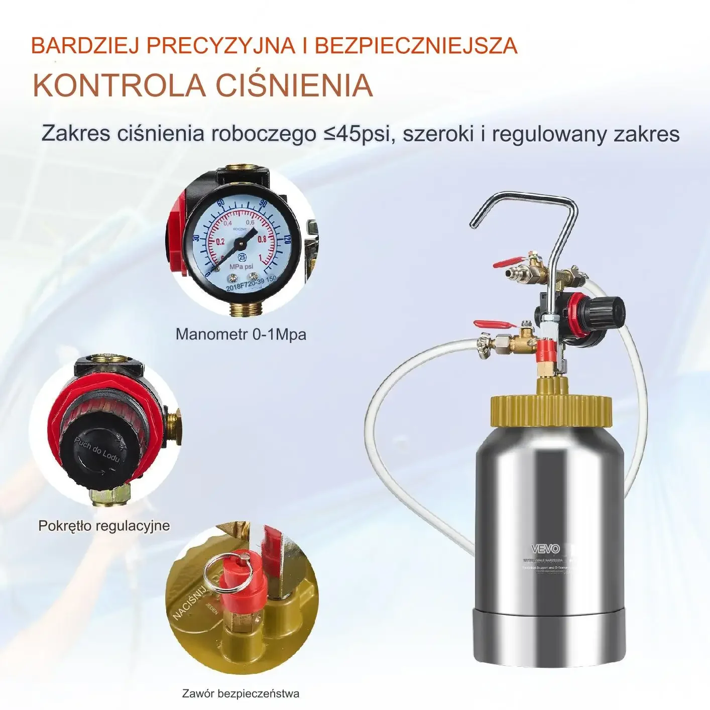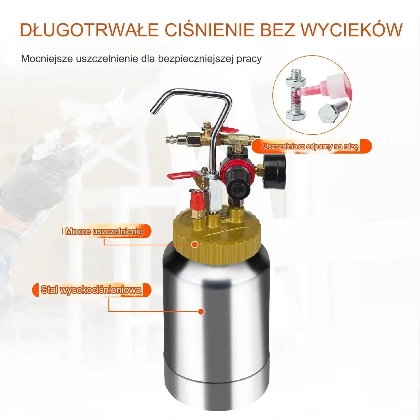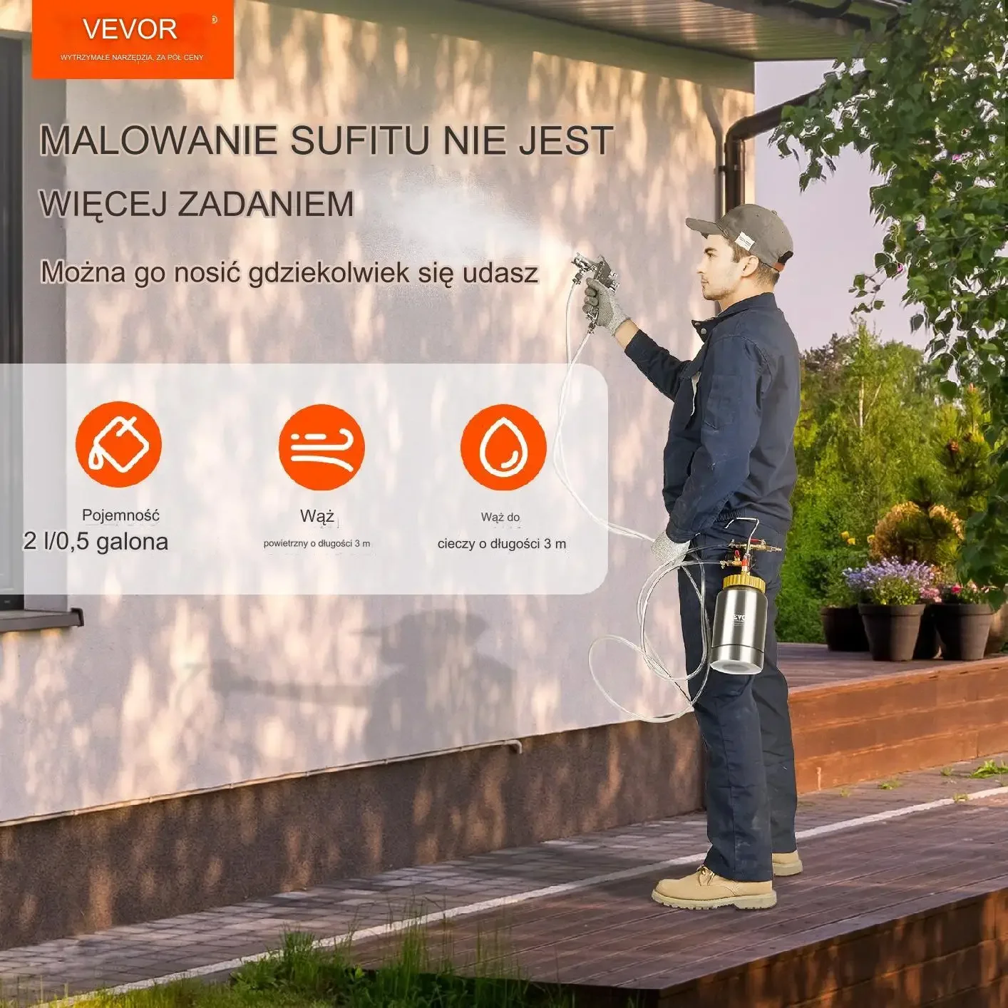 Nowoczesny zbiornik ciśnieniowy na farbę w sprayu o pojemności 2 litrów jest lekki i wygodny do przenoszenia. Idealny do malowania sufitów i innych wysokich miejsc.