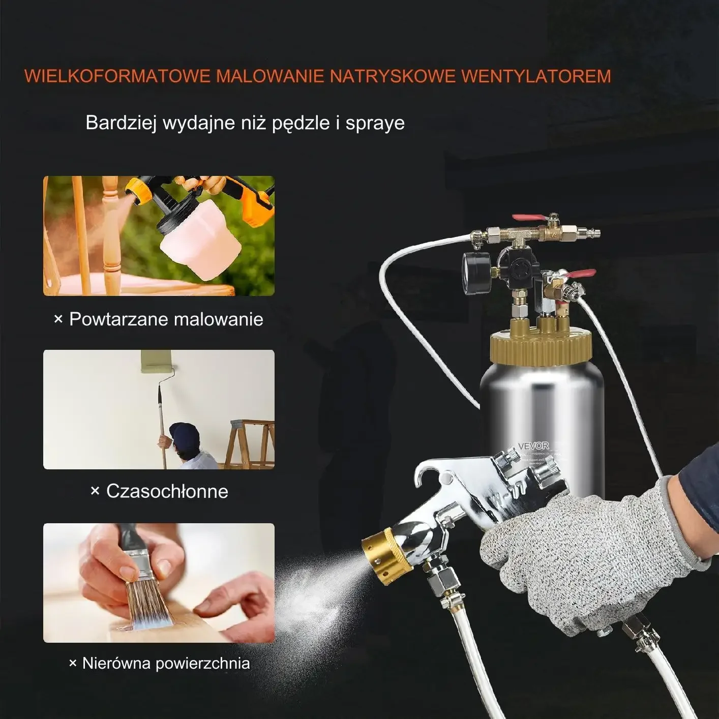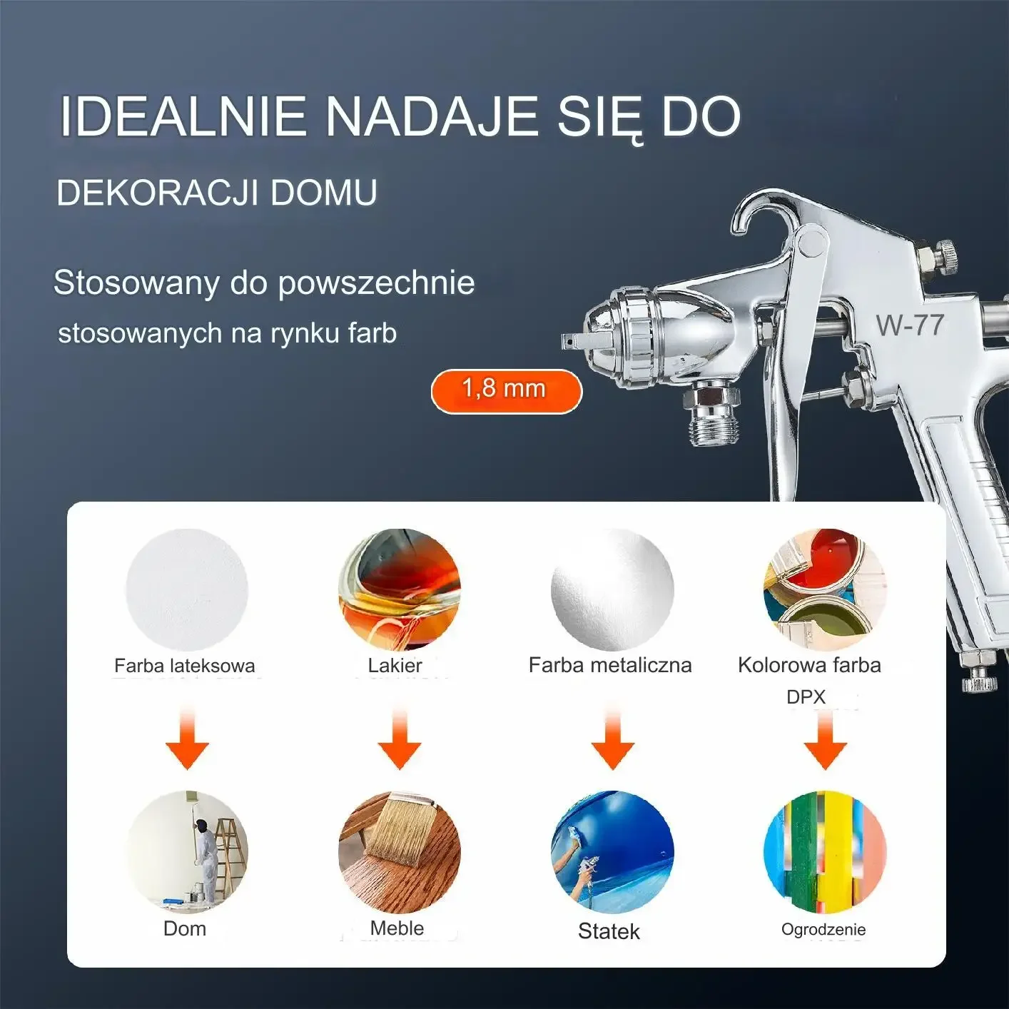 Wyposażony w pistolet z dyszą 1,8 mm, nadaje się do farb lateksowych i metalicznych. Trzy pokrętła umożliwiają regulację przepływu powietrza, farby i szerokości natrysku, zapewniając równomierną atomizację.