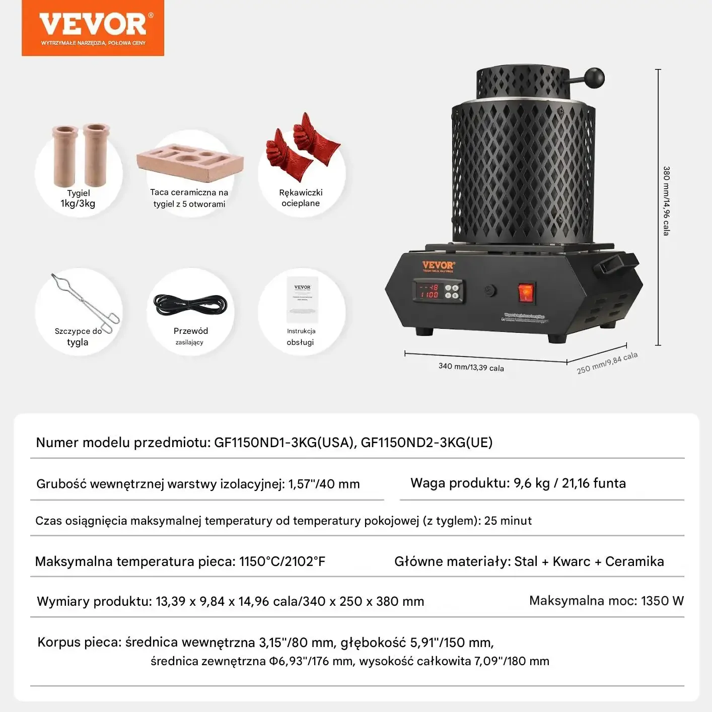 - ☑️Moc: 1350 W pozwala osiągnąć maksymalną temperaturę 1150°C w zaledwie 25 minut.