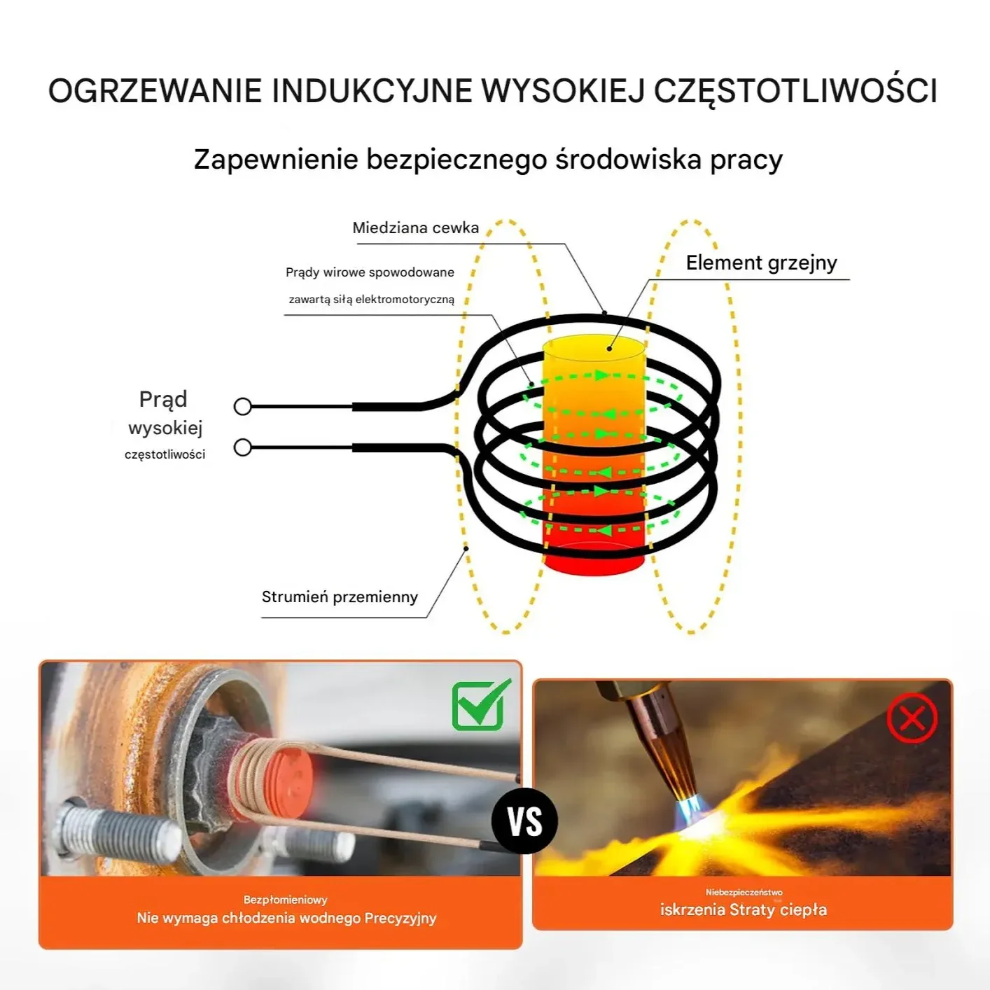 - ✅ Bezpłomieniowe nagrzewanie indukcyjne: Technologia wysokiej częstotliwości szybko i precyzyjnie nagrzewa metalowe elementy bez otwartego ognia, iskier i dymu, gwarantując najwyższy poziom bezpieczeństwa.