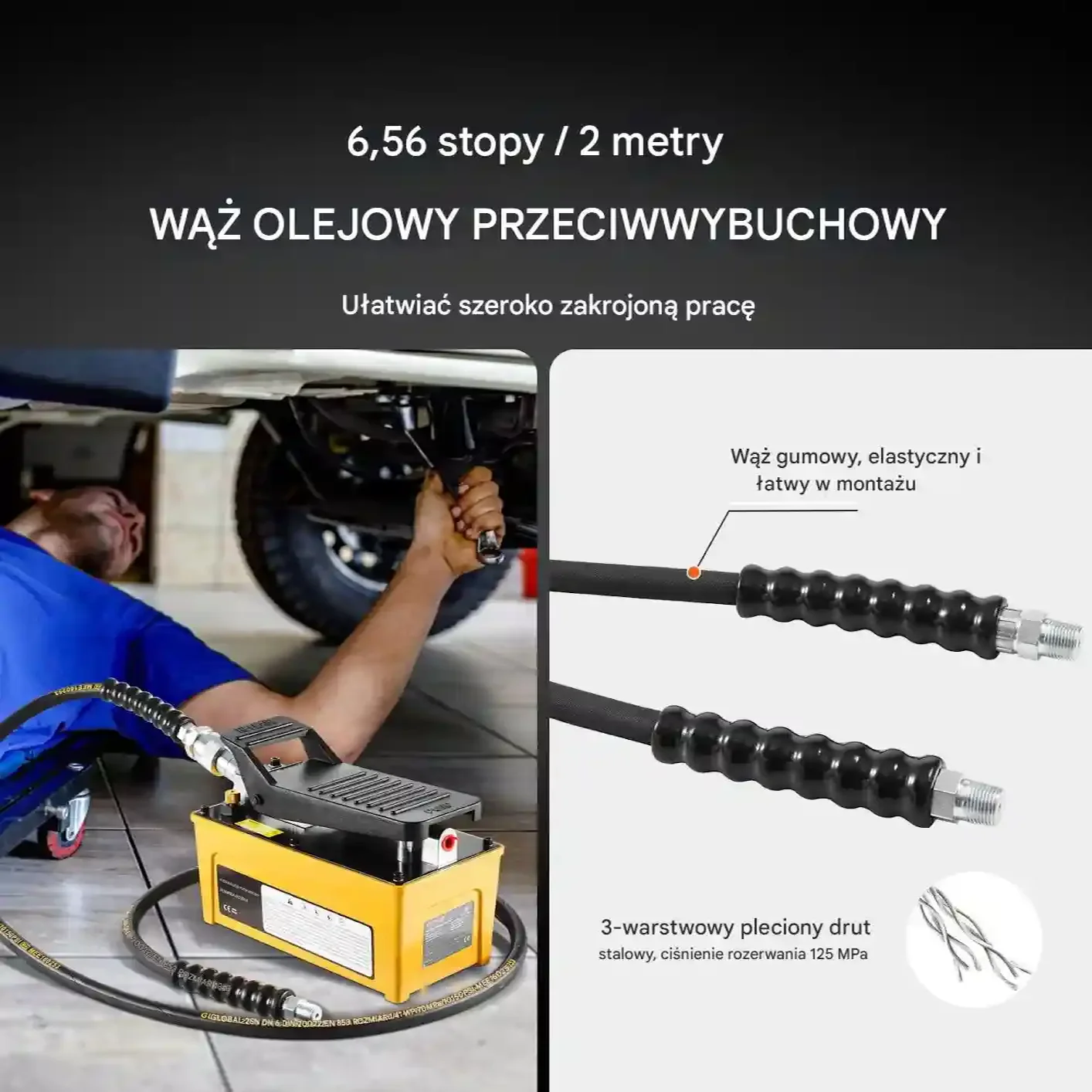• Długi i wytrzymały wąż olejowy: 2 m gumowego węża z trzema warstwami stalowego drutu – ciśnienie do 125 MPa, brak wycieków i elastyczna praca na odległość