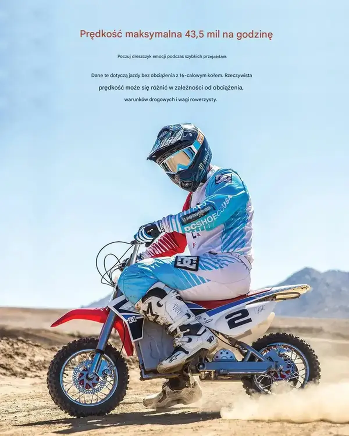 - ✅ Szybka jazda: Prędkość do 59 km/h przy kole 16 cali, prędkość biegu jałowego do 78 km/h