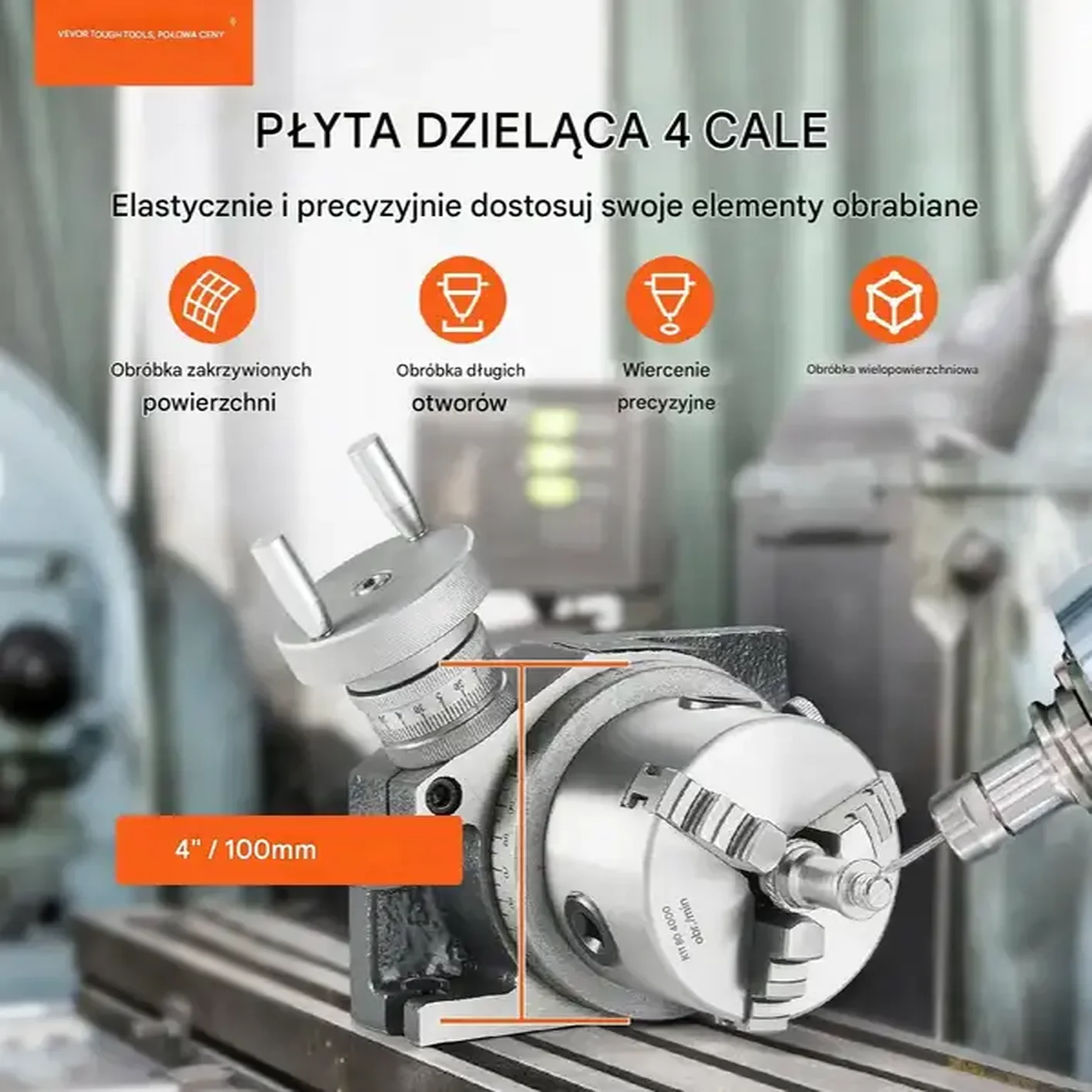 Podzielnica frezarska z uchwytem trójszczękowym 80 mm i średnicą stołu 100 mm to profesjonalne narzędzie dla warsztatów i pracowni inżynierskich. Zapewnia dokładne pozycjonowanie, wszechstronność i niezawodność, idealne do frezowania, wiercenia i indeksowania. Solidna konstrukcja i precyzyjny uchwyt gwarantują stabilność i wysoką jakość obróbki.