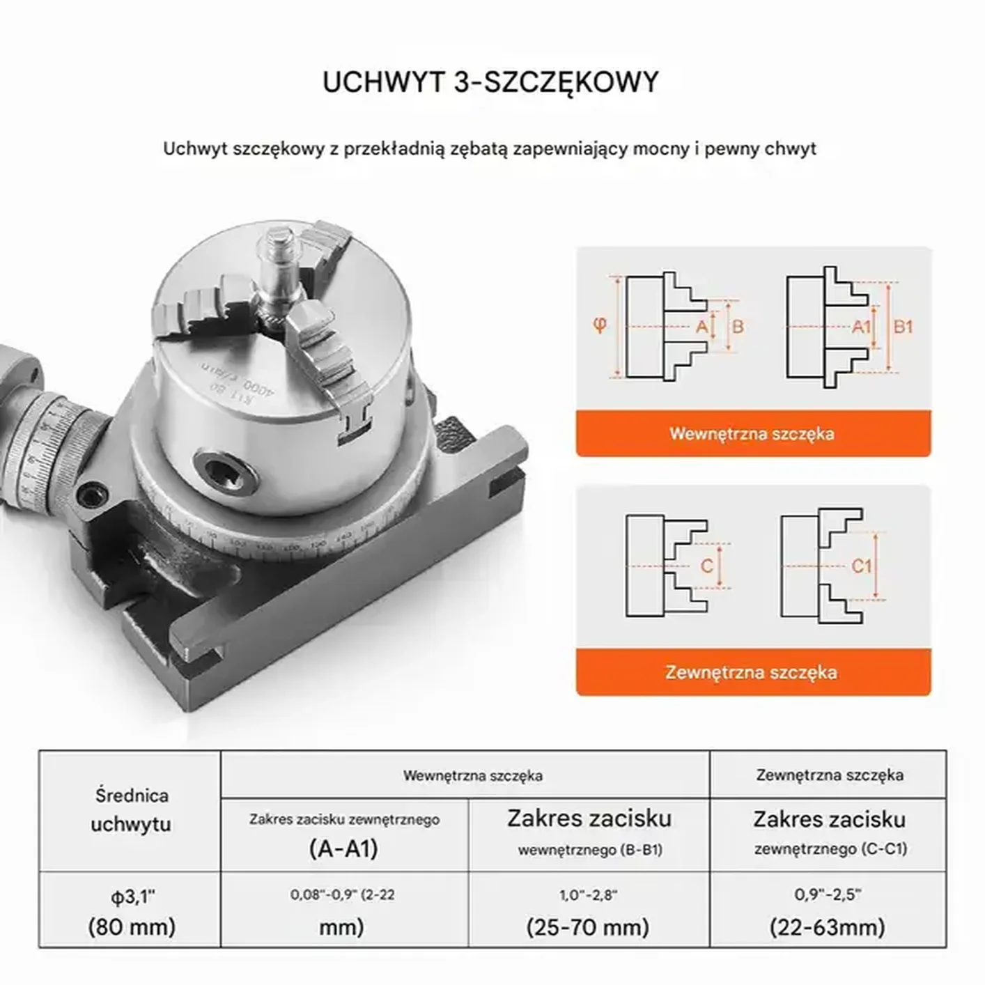 - ✅ Precyzyjny uchwyt trójszczękowy 80 mm – pewne mocowanie detali dla bezpiecznej obróbki.