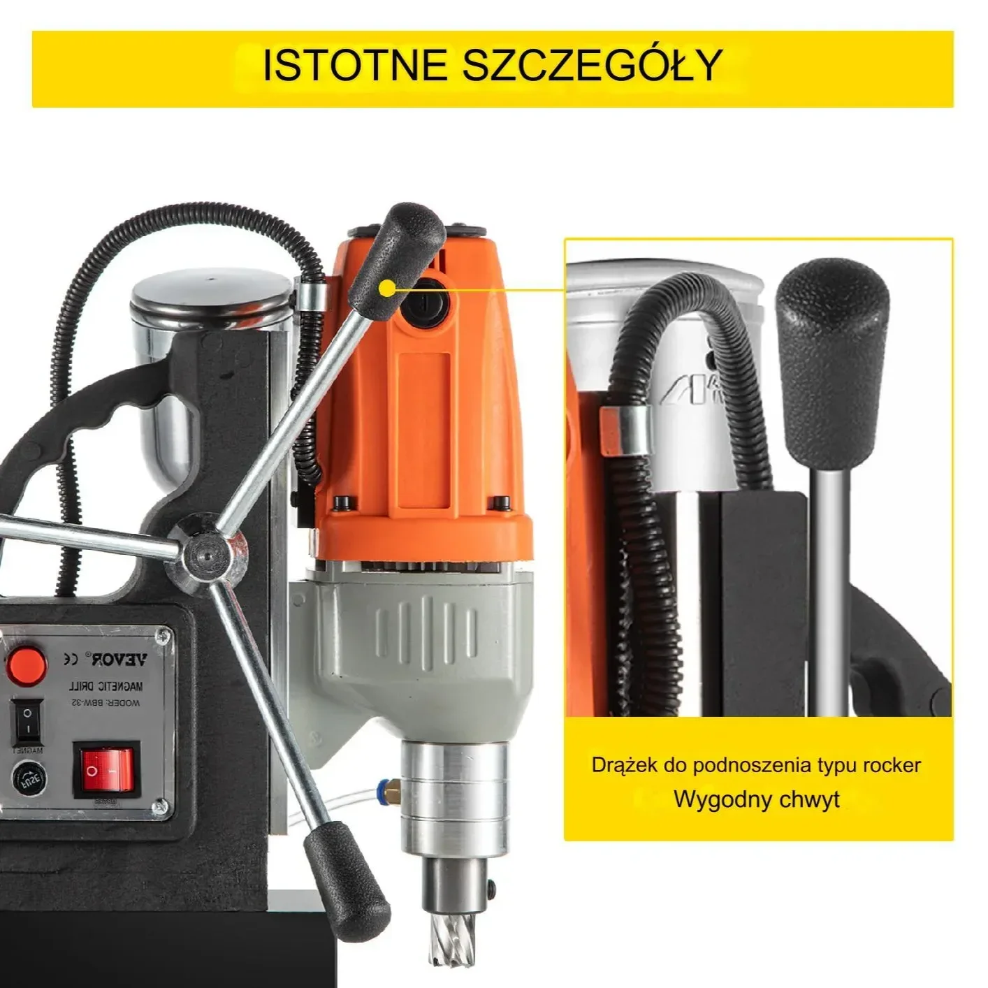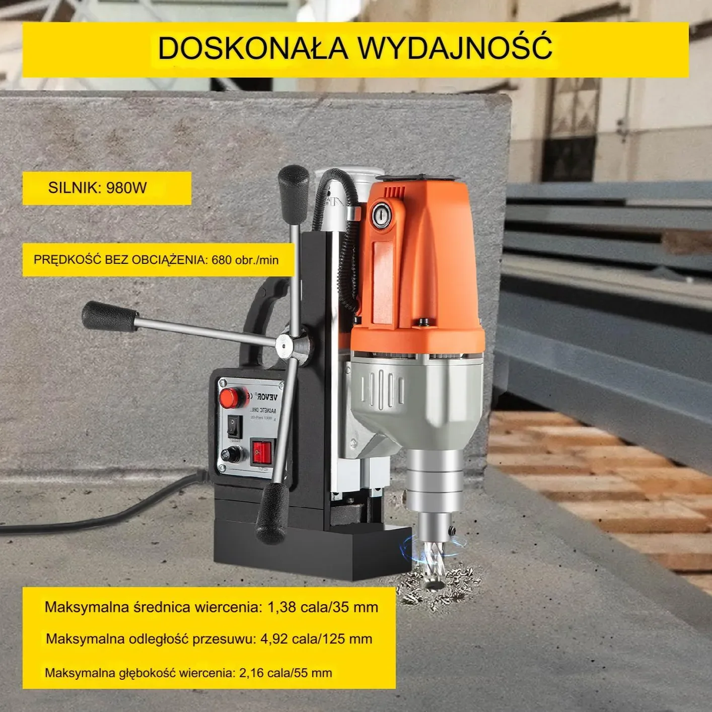 Z mocą 980 W i siłą przyciągania magnetycznego 10 000 N, oferuje wysoką stabilność i precyzyjne wiercenie.