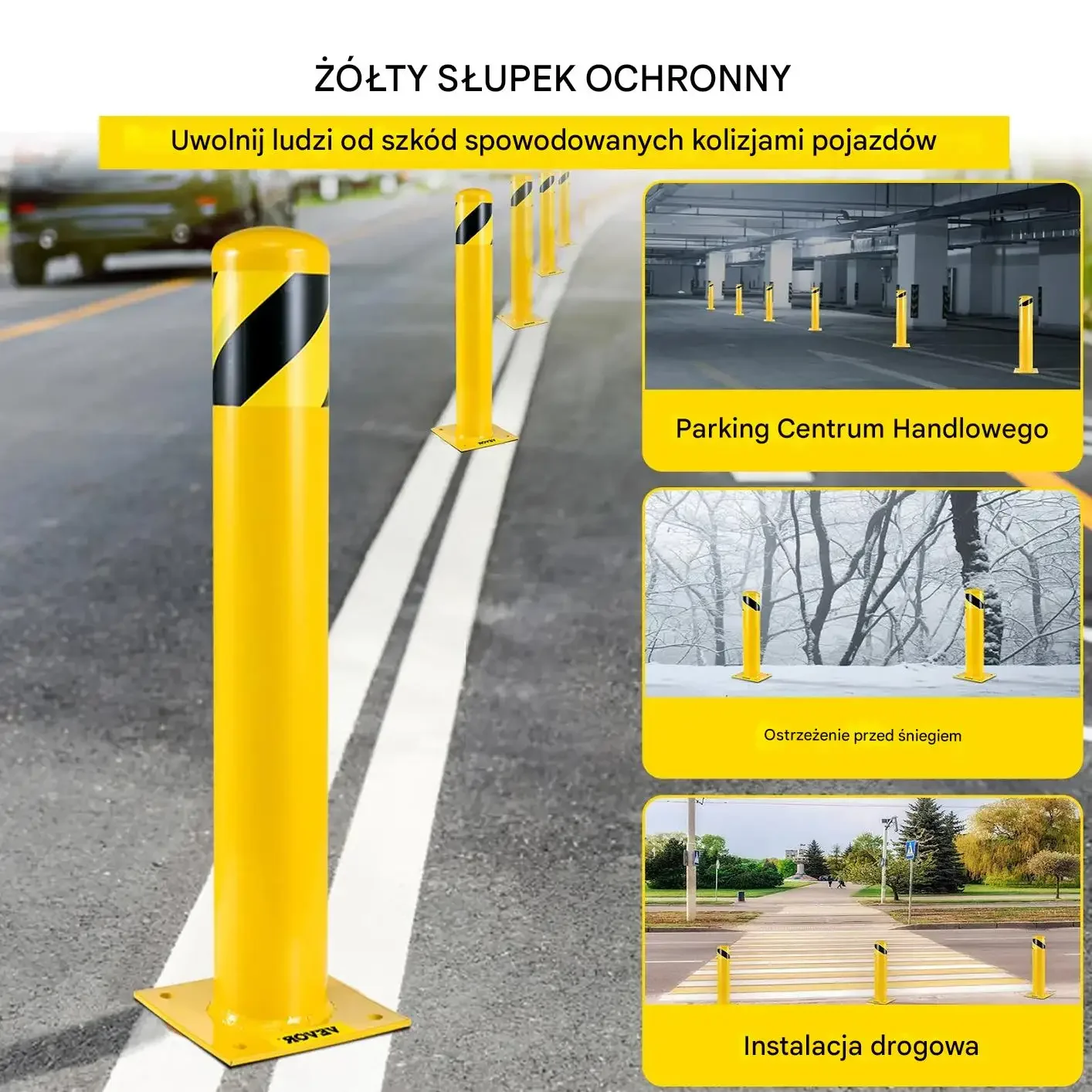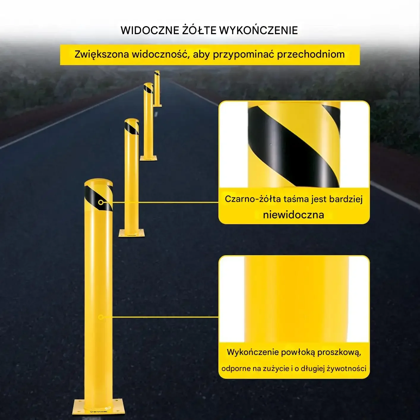 • Wysoka widoczność: Intensywny kolor żółty z czarnymi pasami ostrzegawczymi zwiększa bezpieczeństwo w dzień i w nocy