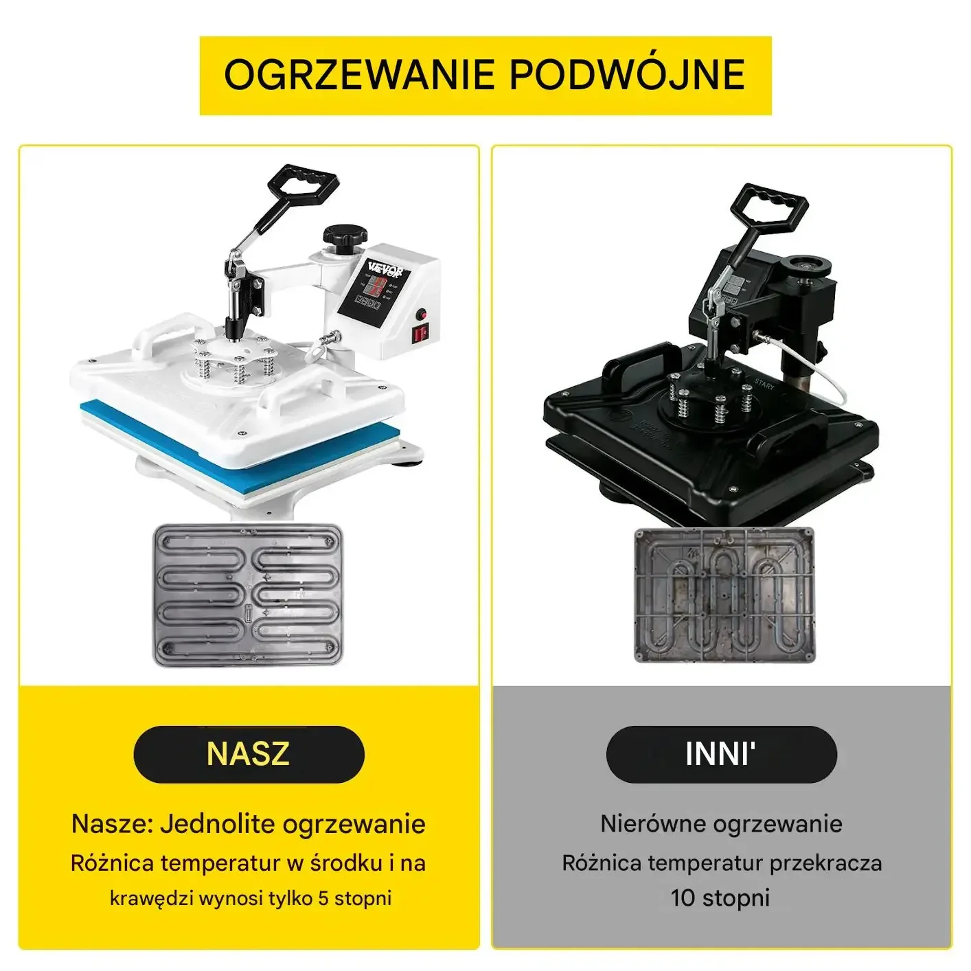- ✅ Podwójne rurki grzewcze: Zapewniają jednolite grzanie i doskonałą jakość transferu.