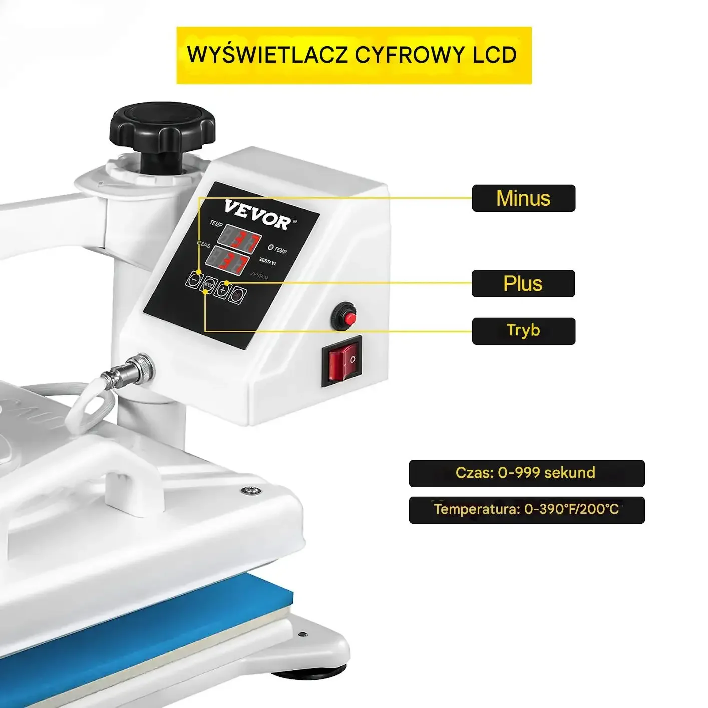 Urządzenie wyposażone jest w cyfrowy wyświetlacz LCD, który posiada przyciski „Minus”, „Plus” oraz „Tryb”. Zakres ustawień czasu wynosi od 0 do 999 sekund, a temperatury od 0 do 200°C.