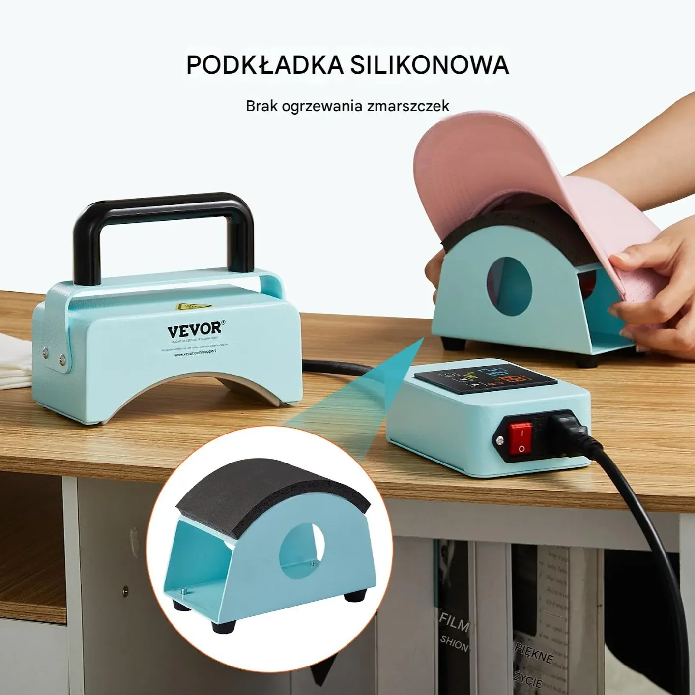 Prasa termiczna jest wyposażona w elastyczną i sprężystą silikonową podkładkę, która dostosowuje się do różnych kształtów i rozmiarów, zapewniając gładkie wykończenie bez zagnieceń. Chroni czapki przed uszkodzeniami i utrzymuje je w idealnym stanie.