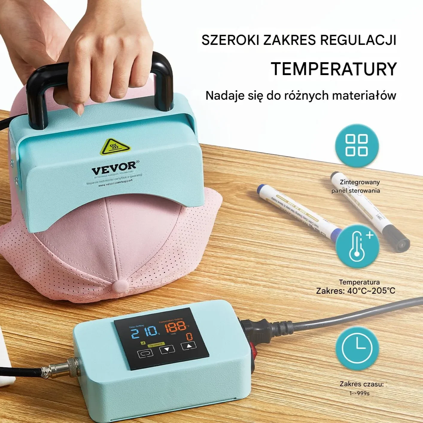 Prasa oferuje szeroki zakres temperatur od 40°C do 205°C, dostosowując się do potrzeb różnych materiałów. Zarówno przy niskich, jak i wysokich temperaturach pozwala na precyzyjne i łatwe wykonywanie nadruków.