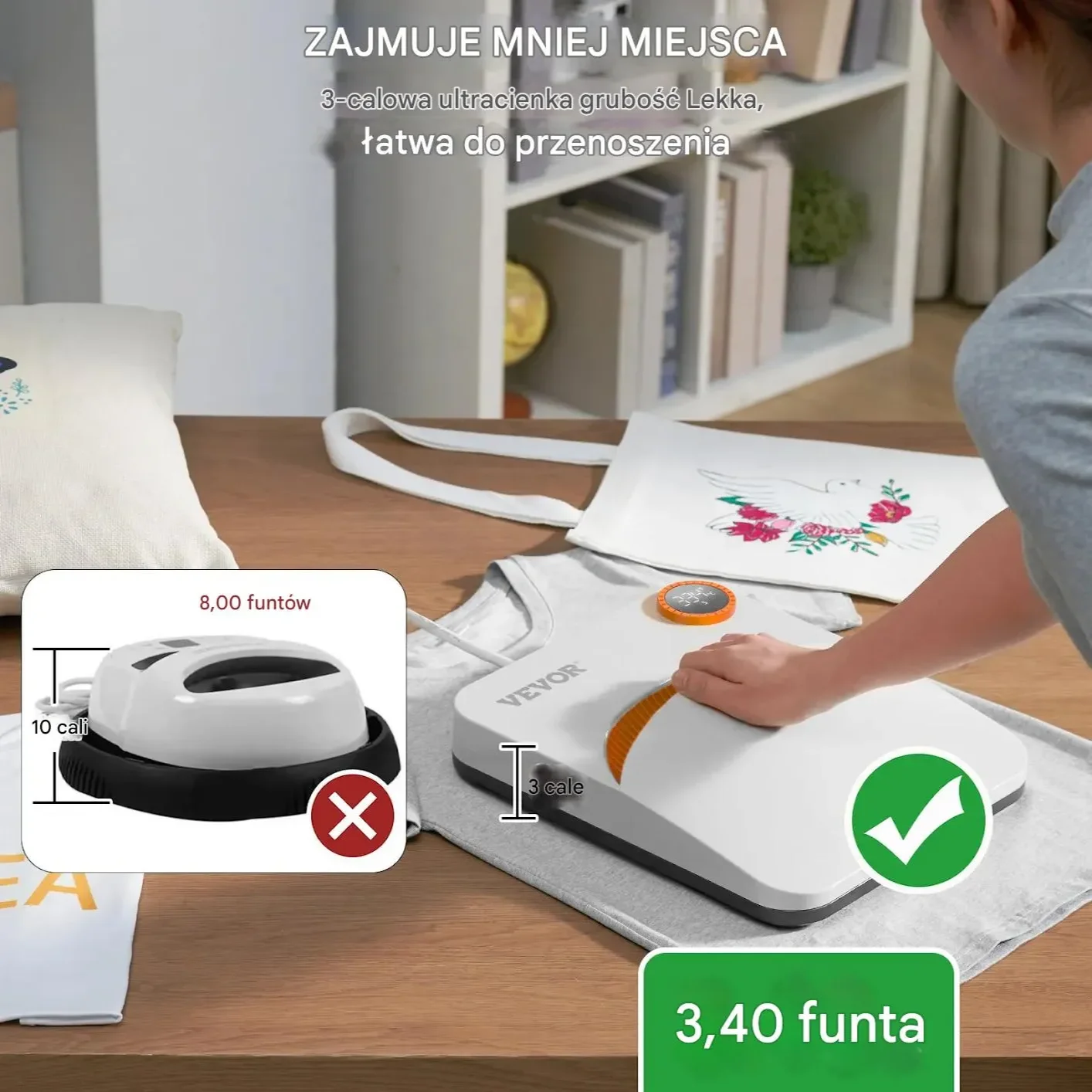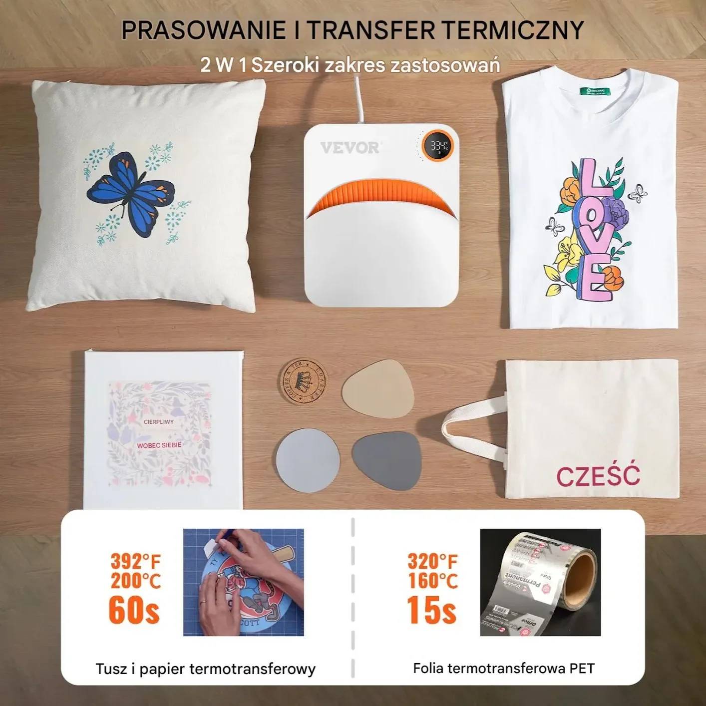- ⭐ Personalizacja T-shirtów: Umożliwia szybkie transfery wzorów, rozwiązując problem nierównomiernego nagrzewania zwykłymi żelazkami i zapewniając trwałe nadruki
