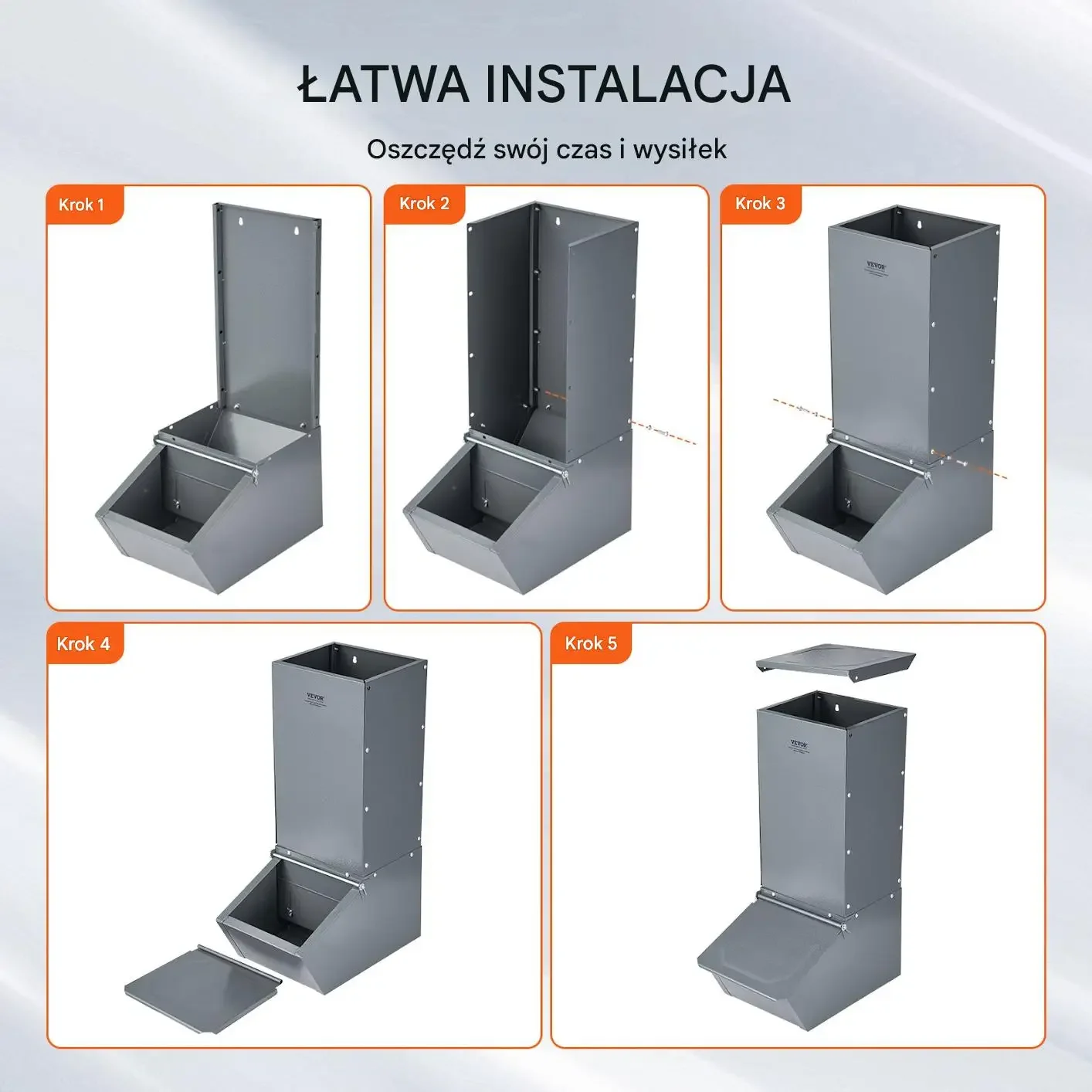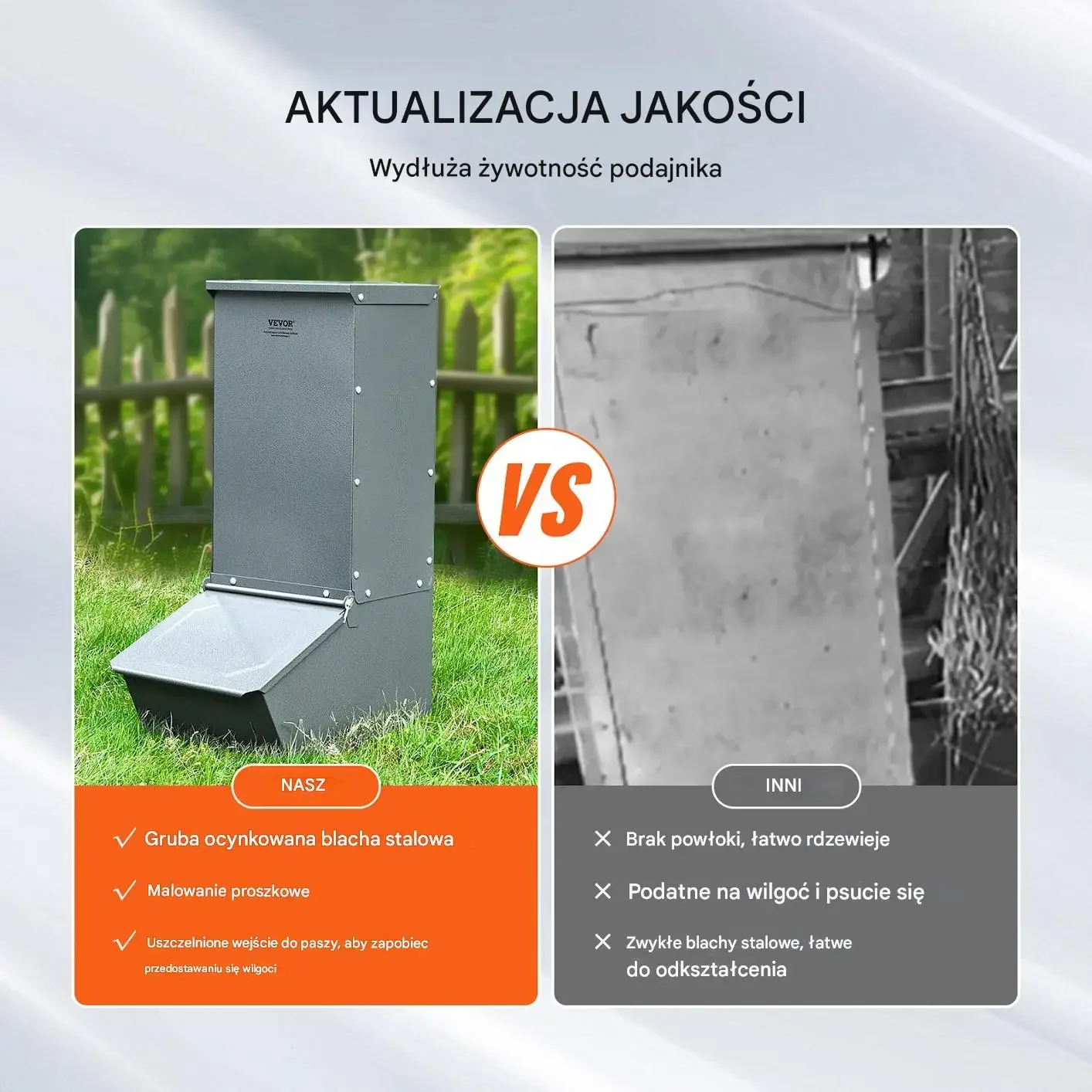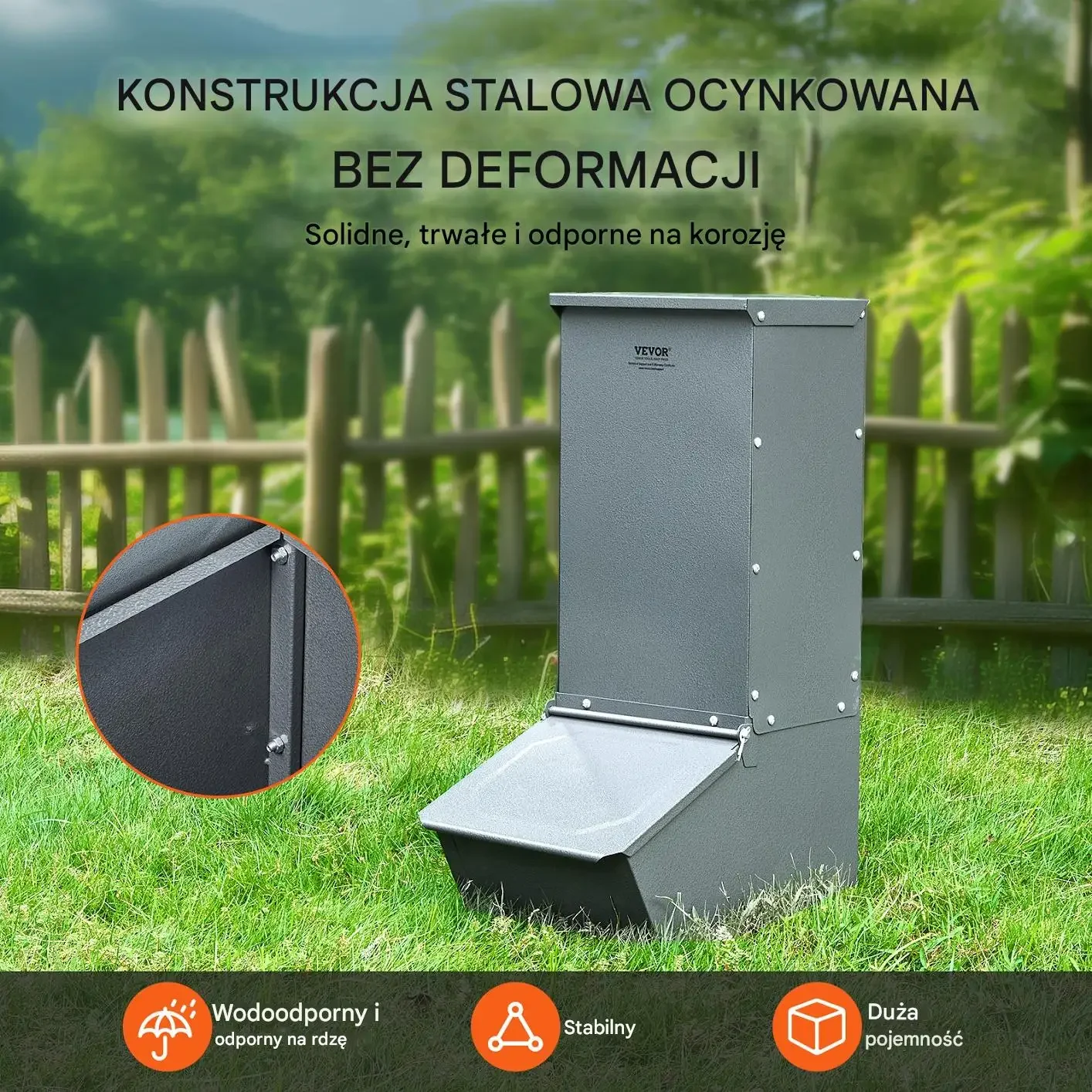 Gruba stalowa obudowa z ocynkowaniem, odporna na warunki atmosferyczne; uszczelnione bokowe wejście do podajnika zapobiega wydostawaniu się wilgoci oraz chroni przed rdzą.