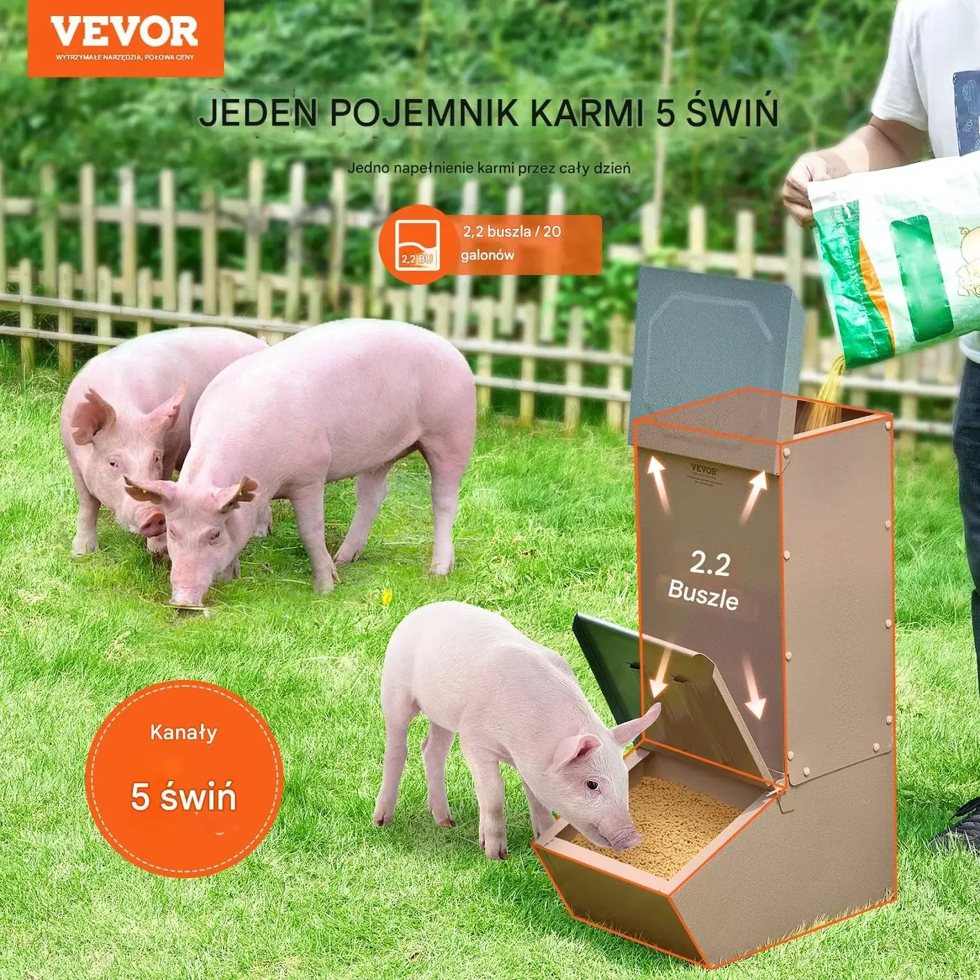 Jedno napełnienie karmy przez cały dzień; pojemność karmy wynosi 2,2 buszla / 20 galonów (karmą można napełniać 5 świń).