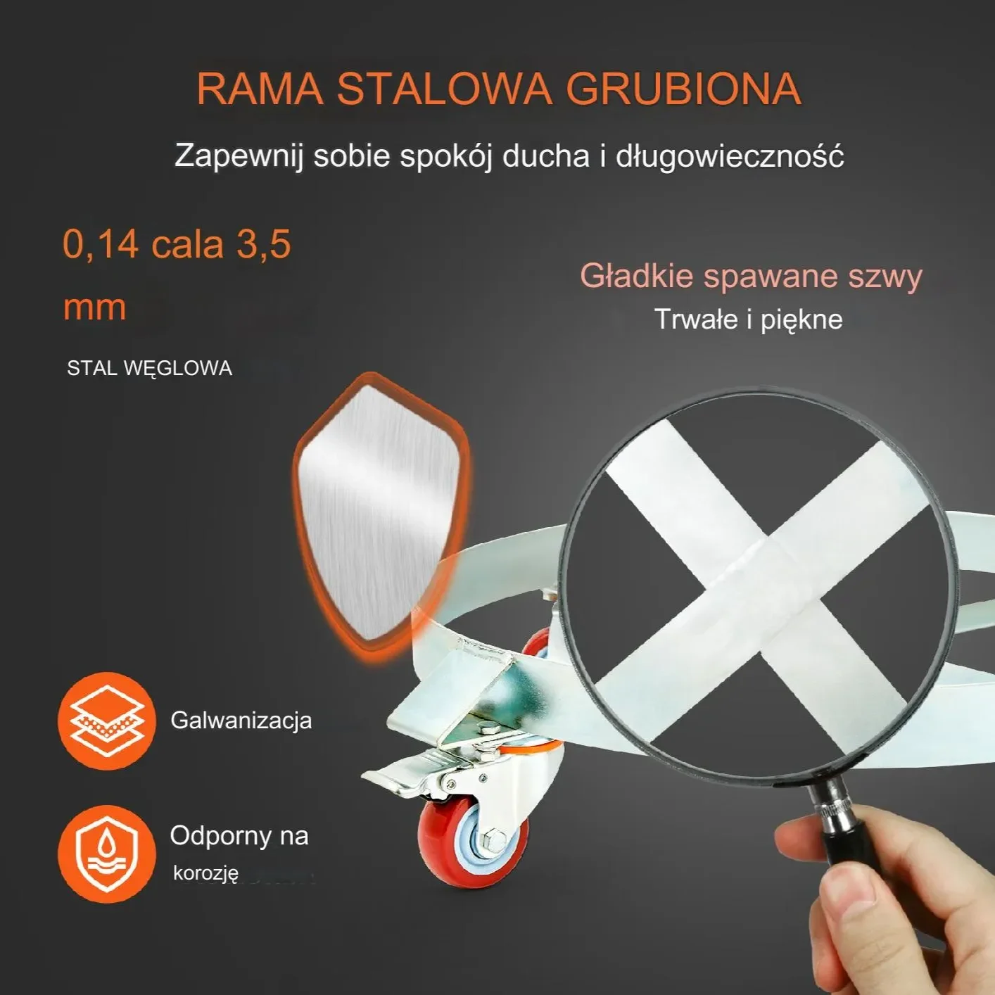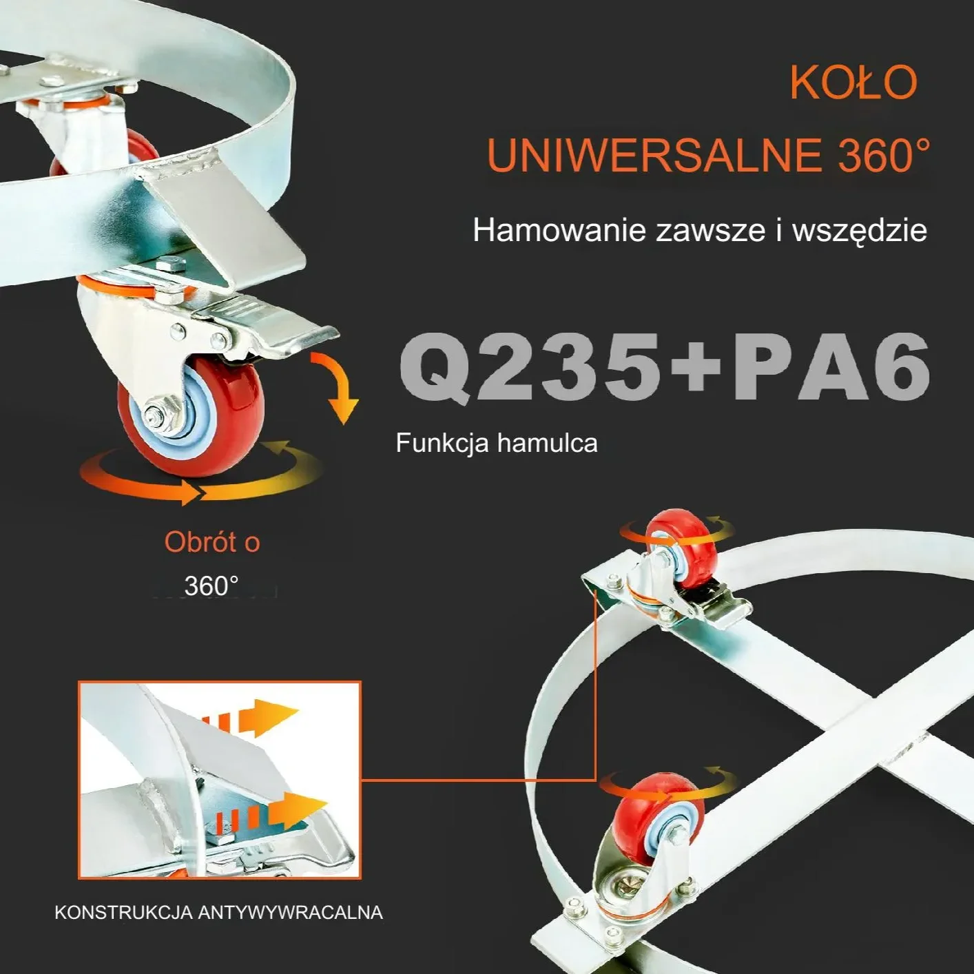 Wózek do beczek jest wyposażony w 4 uniwersalnych kół, w tym dwa z hamulcami, co ułatwia regulację kierunku i hamowanie w dowolnym miejscu i czasie. Wózek do beczek można dowolnie przemieszczać, nawet w ciasnych przestrzeniach. Odporne na wywrócenie skrzydła zmniejszają ryzyko rozlania.