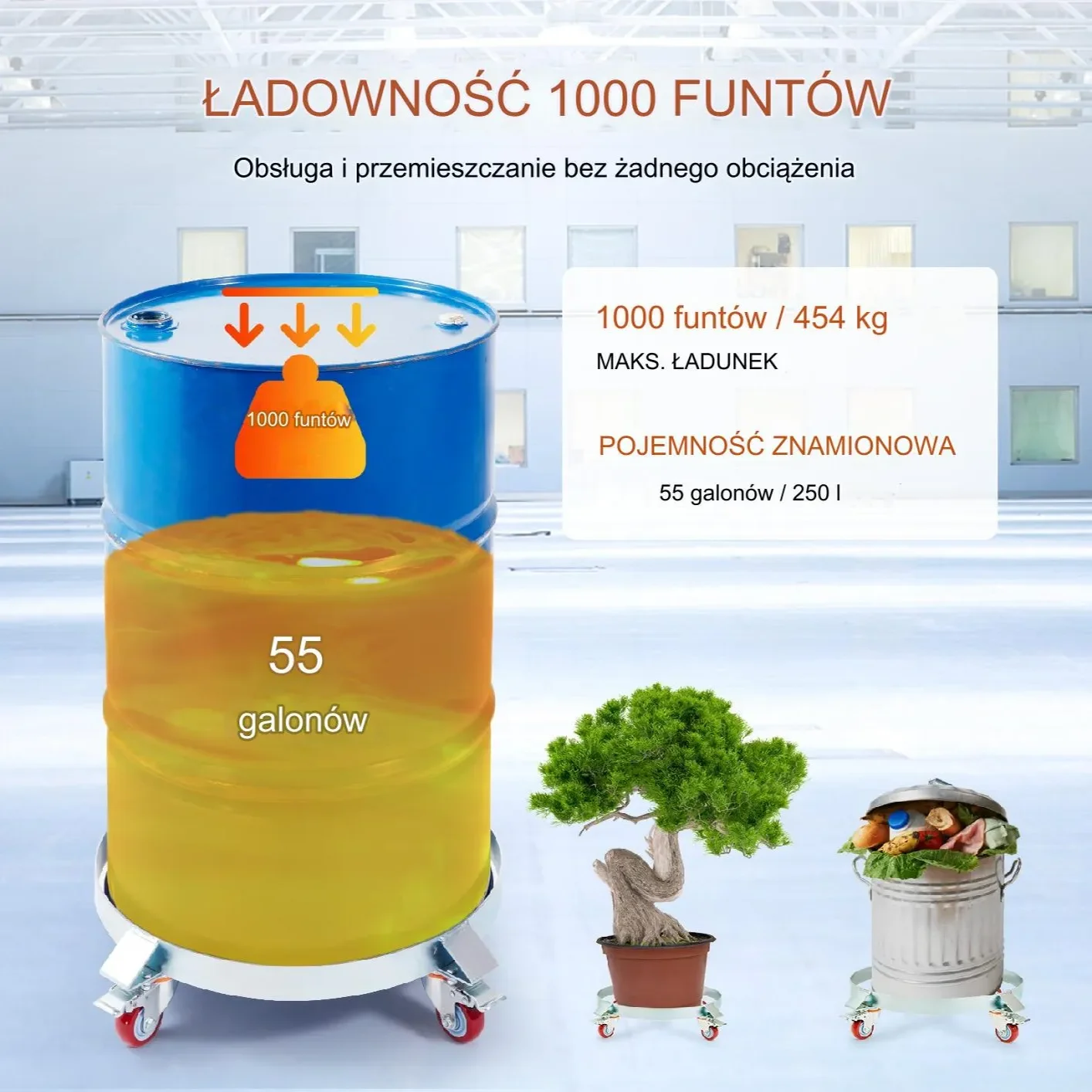 Wózek do beczek VEVOR ma maksymalną ładowność 454 kg i może obsługiwać beczki o pojemności do 250 litrów.