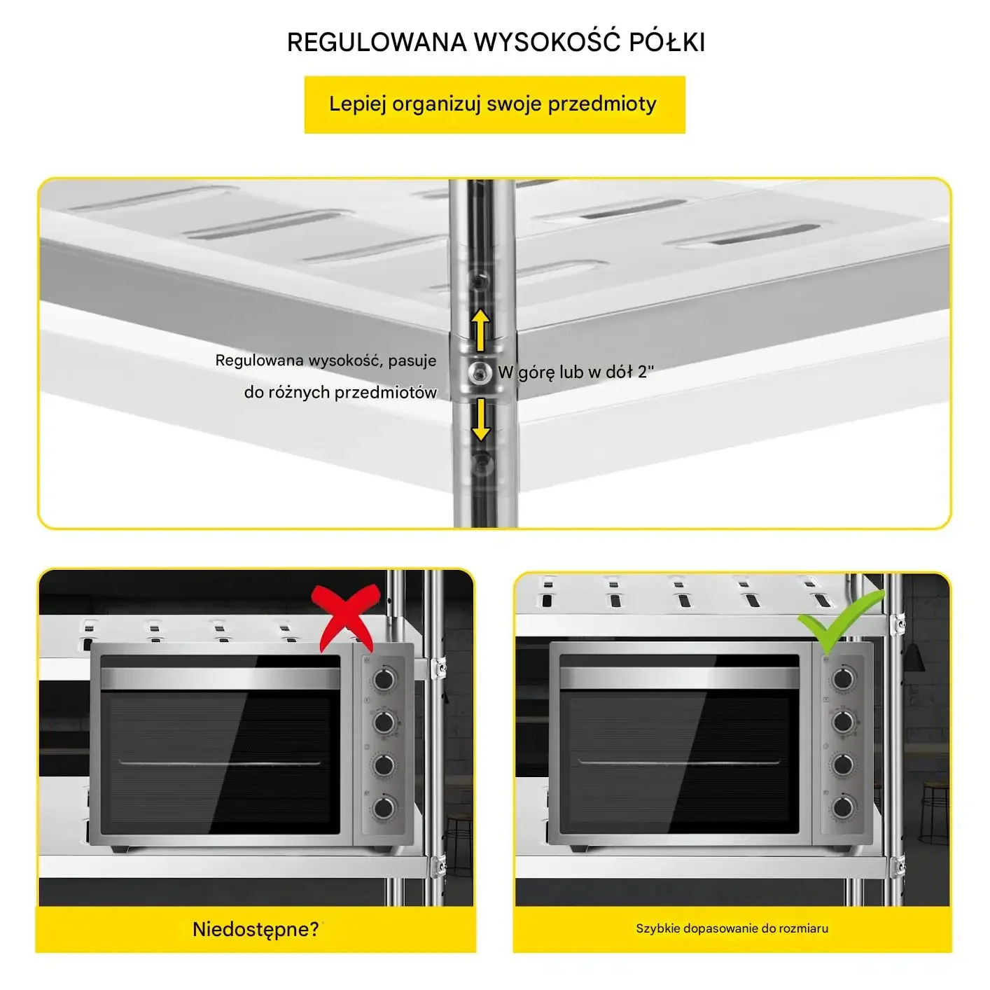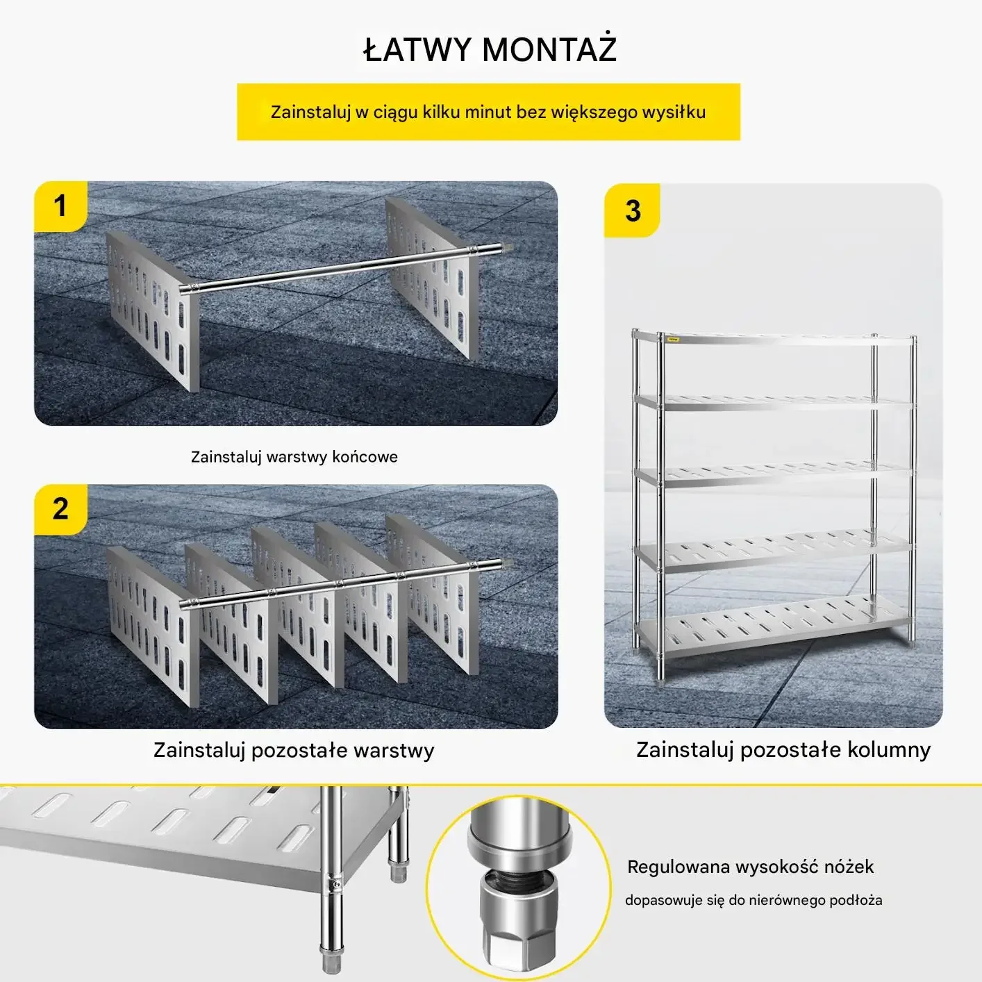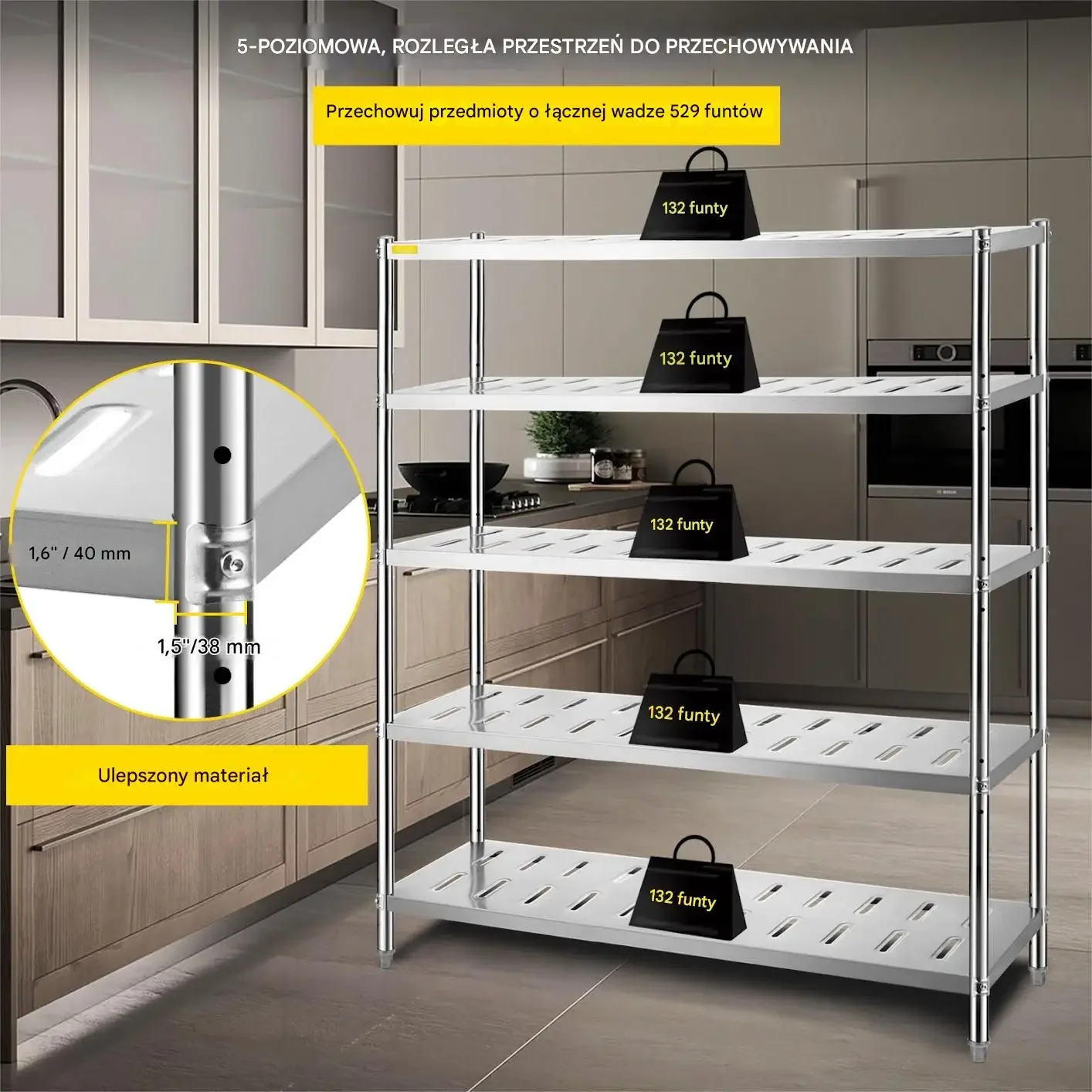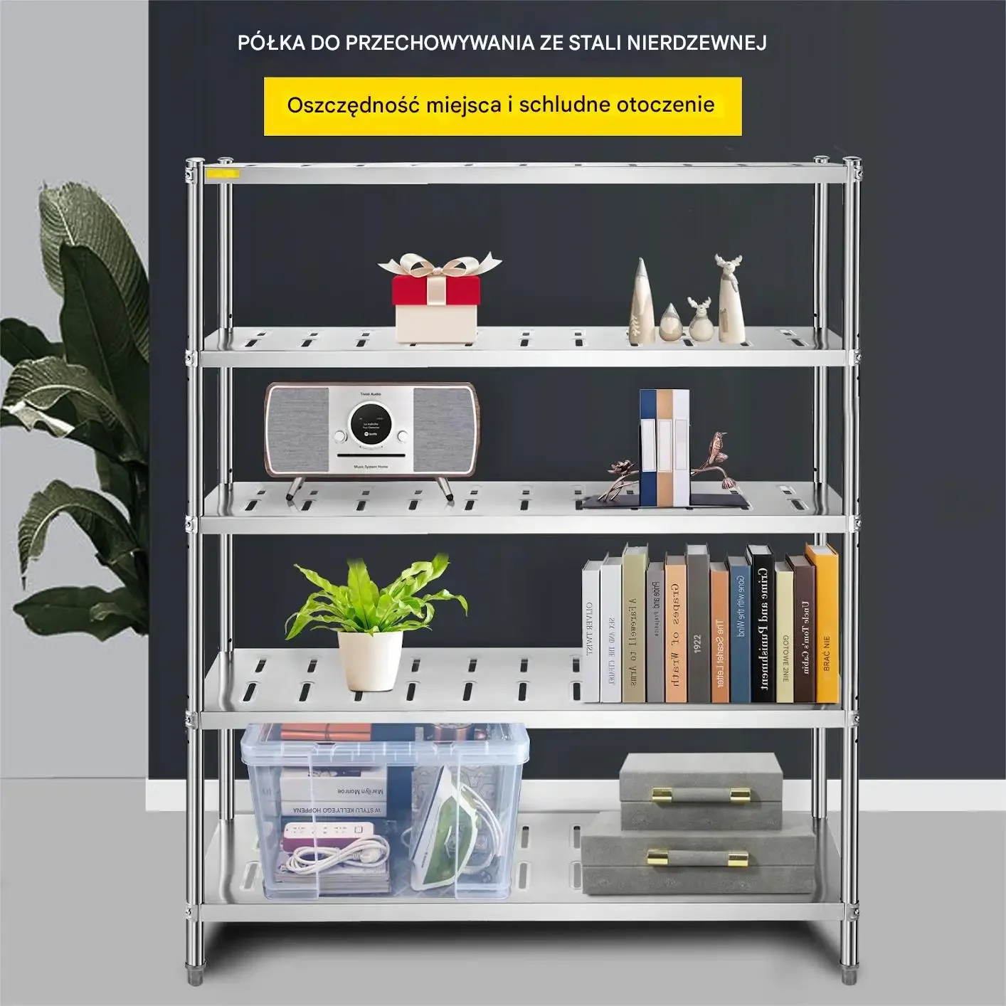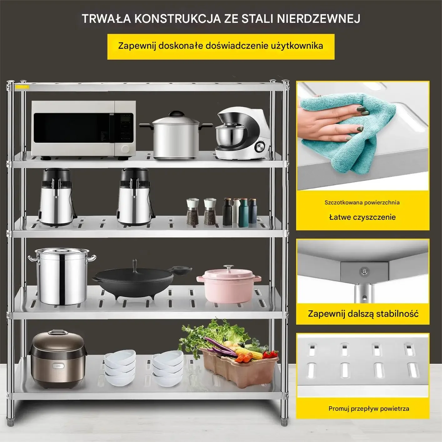 Regał ze Stali Nierdzewnej 5-Półkowy – Wytrzymałe i Regulowane Rozwiązanie do Kuchni, Garażu i Magazynu
