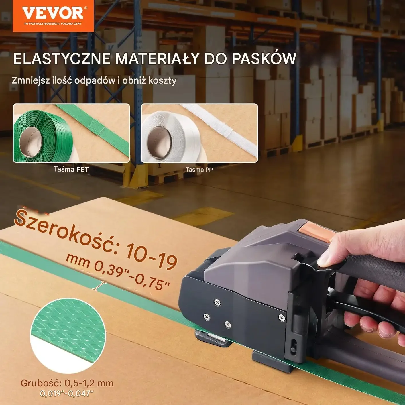 - ✅ Uniwersalne zastosowanie: Kompatybilna z taśmami polipropylenowymi (PP) i poliestrowymi (PET) o szerokości od 10 mm do 19 mm i grubości od 0,5 mm do 1,25 mm.