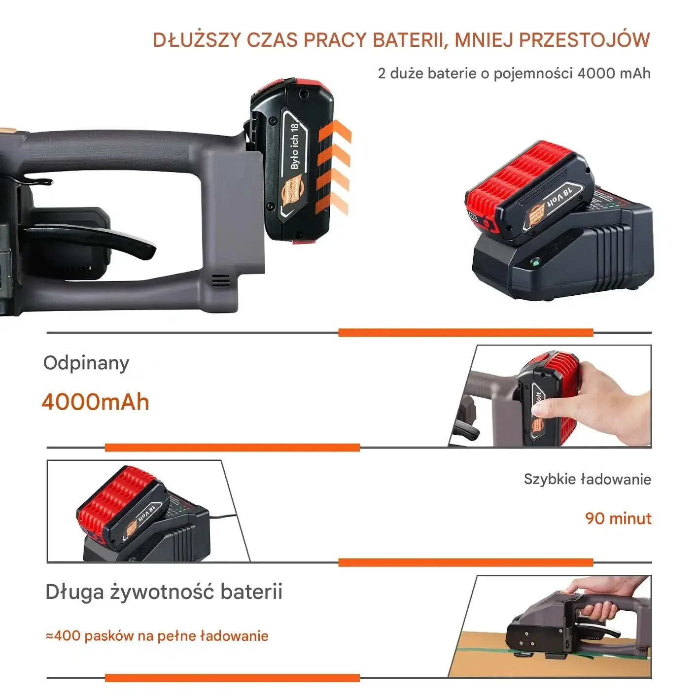 - ✅ Wydajne zasilanie: Zasilana dwoma akumulatorami litowymi 4000 mAh, umożliwia wykonanie do 400 opasek na jednym ładowaniu.