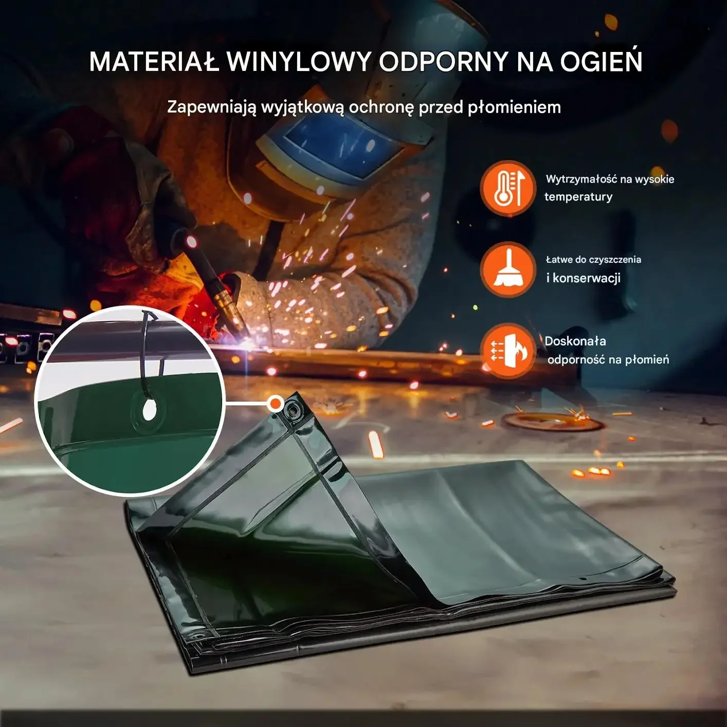 - ✅ Materiał ognioodporny: wykonanie z winylów odpornych na płomień, odpryski i wysoką temperaturę