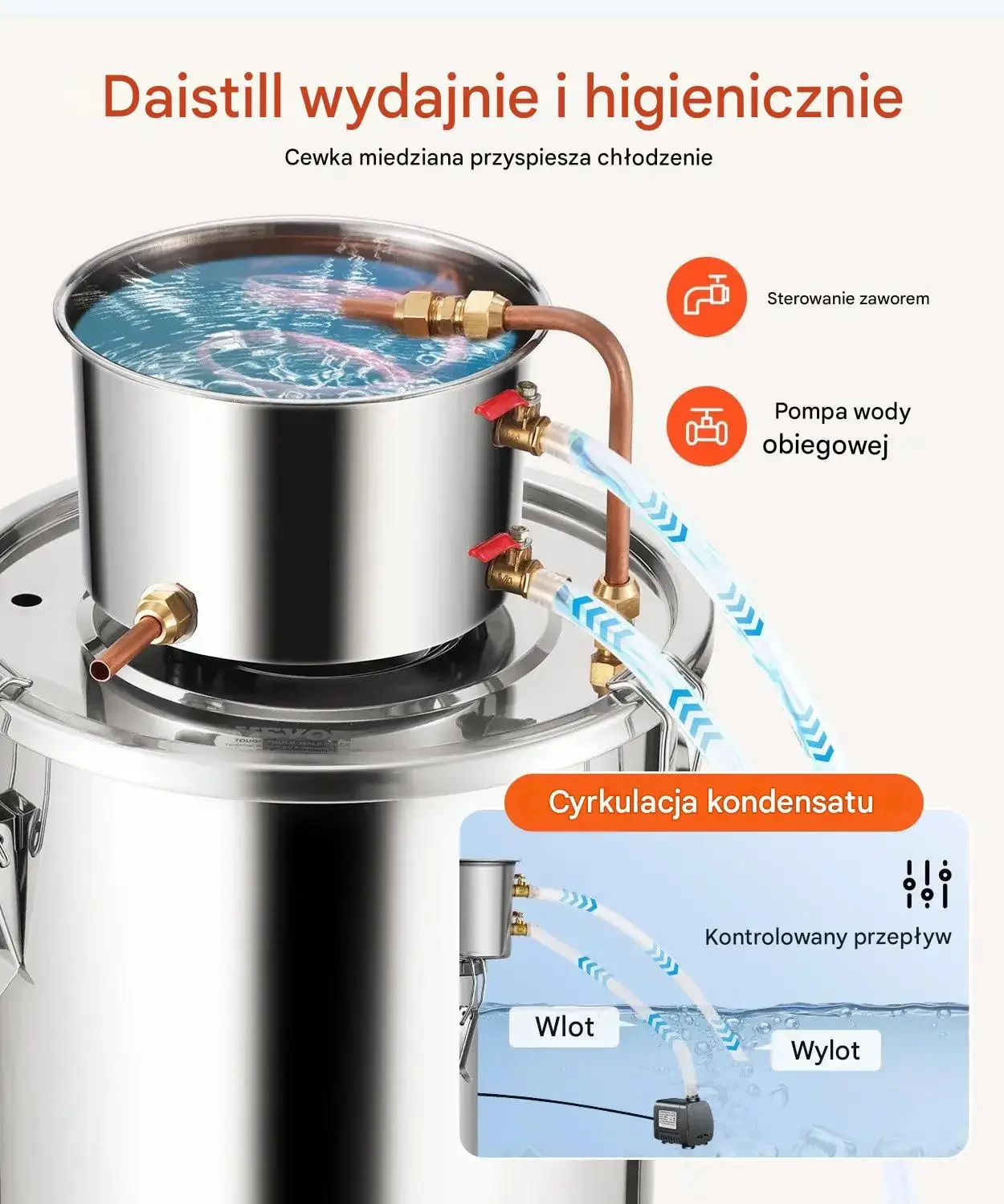 • ➡️ Wysoka jakość produktu końcowego: Miedziana wężownica i pompa wodna zapewniają skuteczne chłodzenie i czystość destylatu, eliminując posmak.