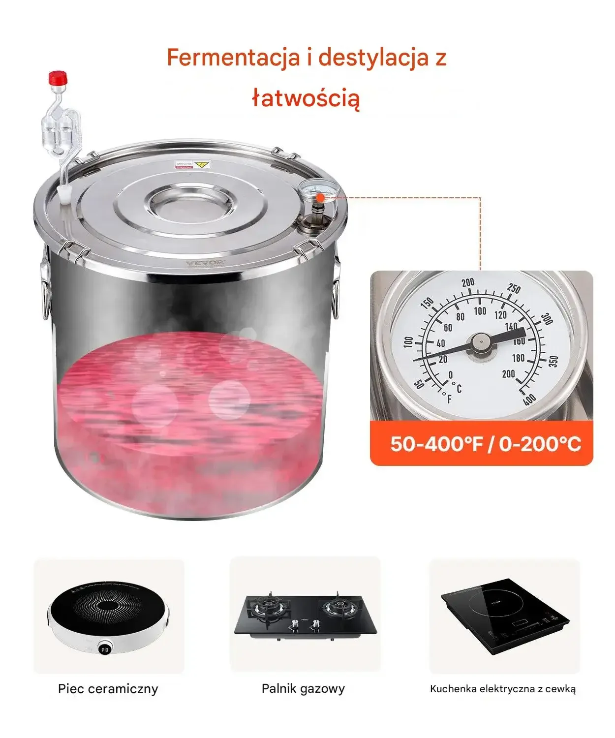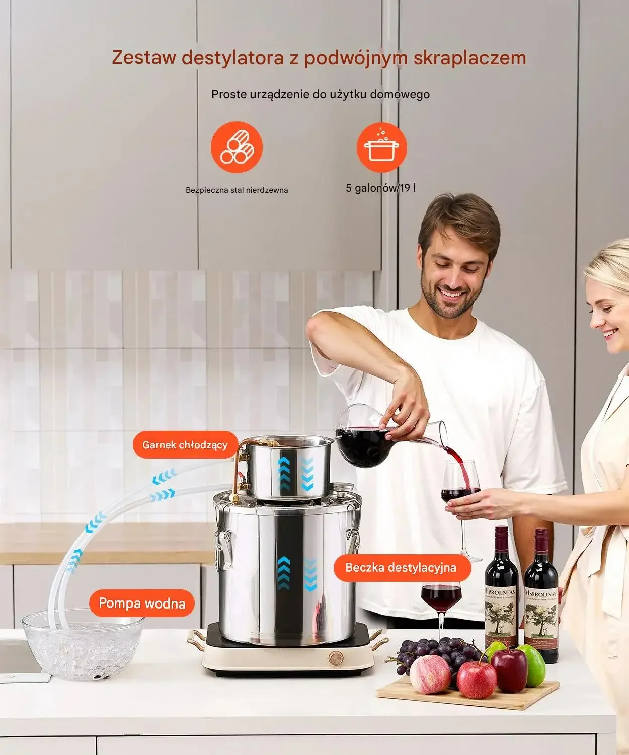 Zestaw destylatora z podwójnym skraplaczem to proste urządzenie do użytku domowego. Beczka destylacyjna o pojemności 19 litrów wykonana jest z bezpiecznej stali nierdzewnej. Proces fermentacji i destylacji jest łatwy, a termometr z podwójnym wyświetlaczem (0°C do 200°C) umożliwia precyzyjną kontrolę temperatury. Destylator może być używany na piecach ceramicznych, palnikach gazowych oraz elektrycznych kuchenkach z cewką.